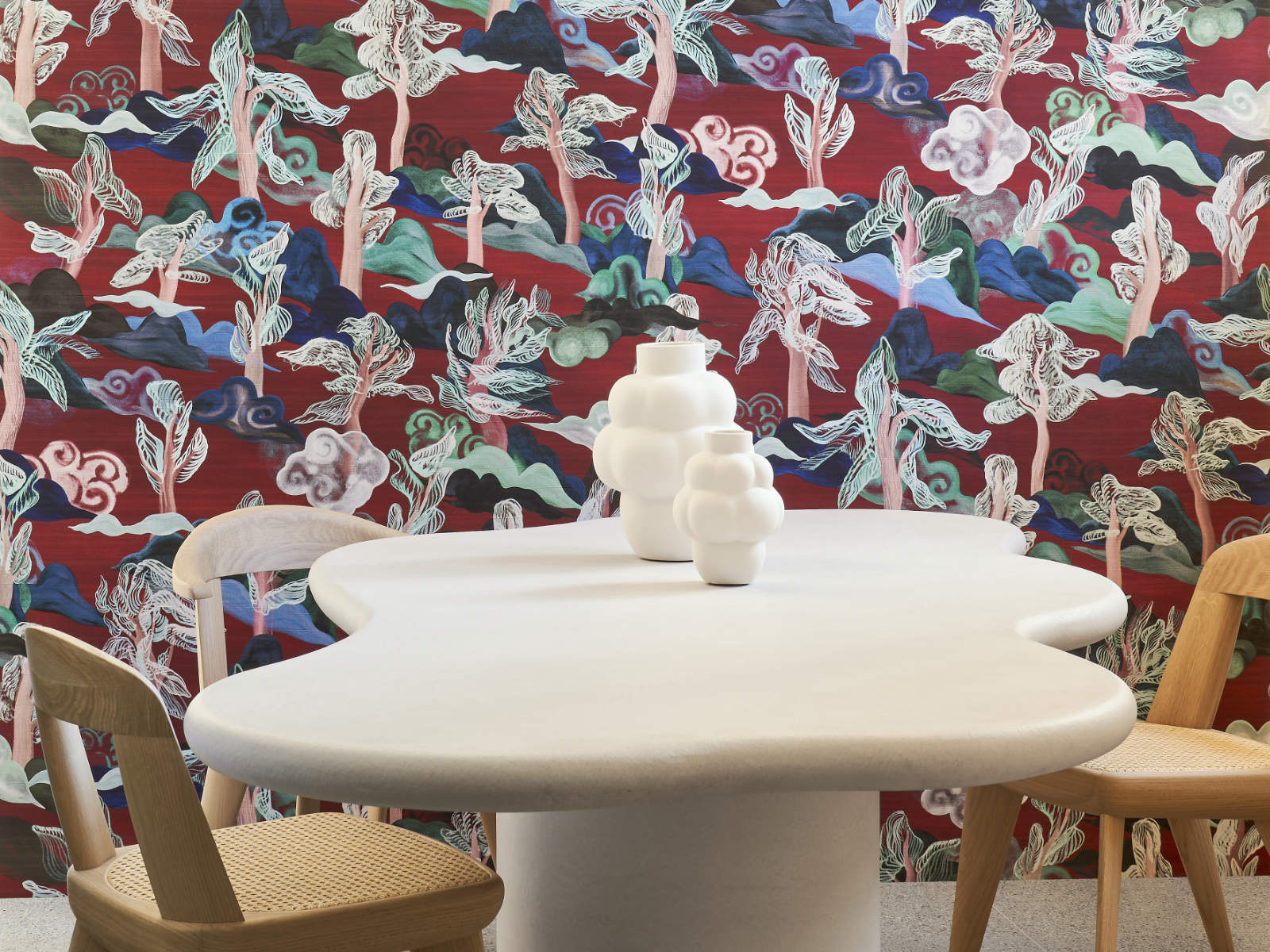 De Alaya Saranda - 11540 van Arte behang toont heuvels en bomen onder een zachte wolkenhemel en is ontworpen in een typisch Aziatische tekenstijl. De naam van dit dessin, Saranda, is afgeleid van het gelijknamige bos in India, wat letterlijk ‘zevenhonderd heuvels’ betekent. Een toepasselijke naam, gezien het patroon van het behang.