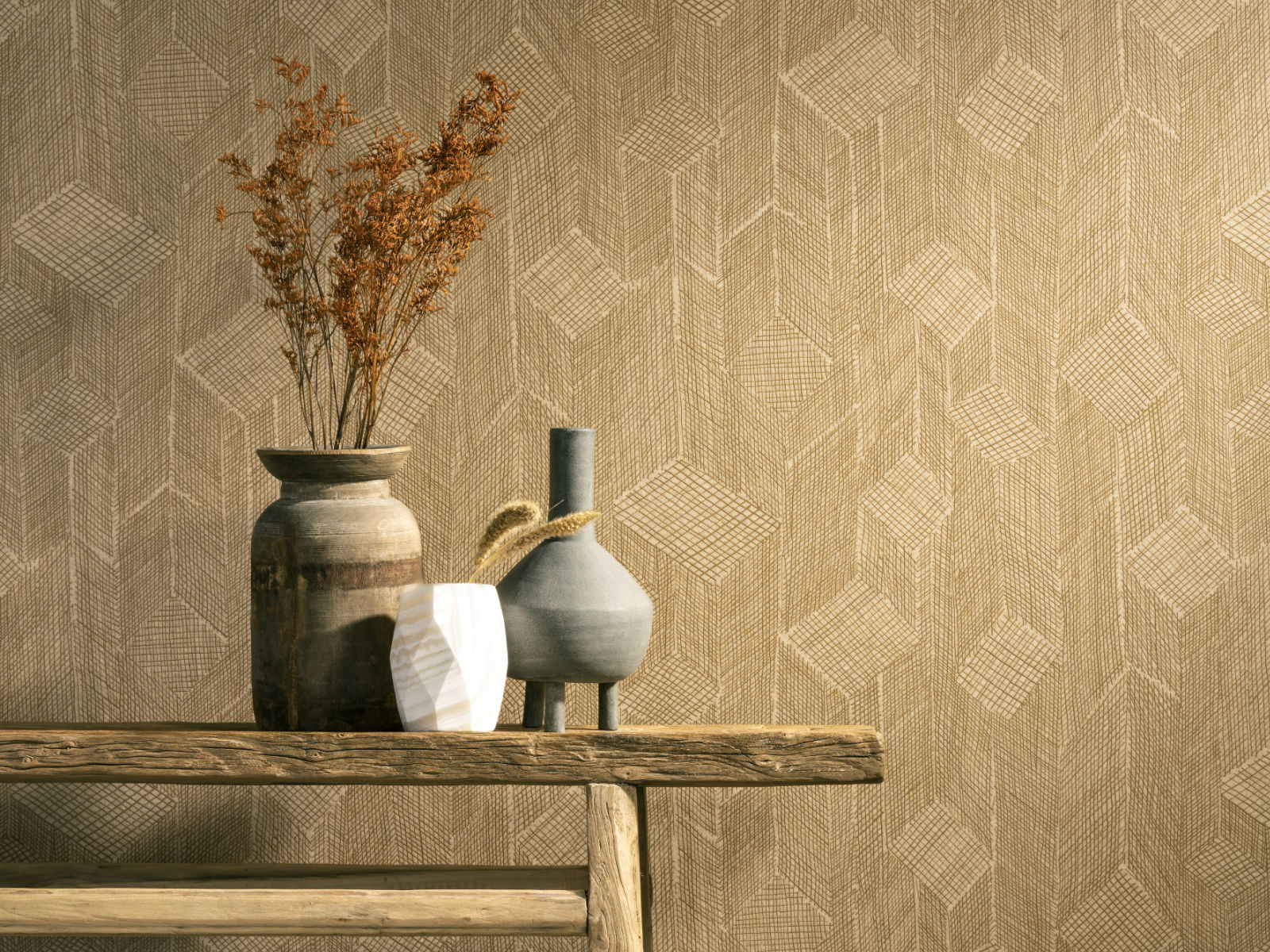 De Cameo Shibam - 66012 van Arte behang heeft een patroon met een subtiel driedimensionaal effect. Dit komt door de interpretatie van een open geweven sisal patchwork in verschillende richtingen. De sisaldraden zijn oneffen en hebben een ruw karakter waardoor de imperfectie goed tot zijn recht komt.
