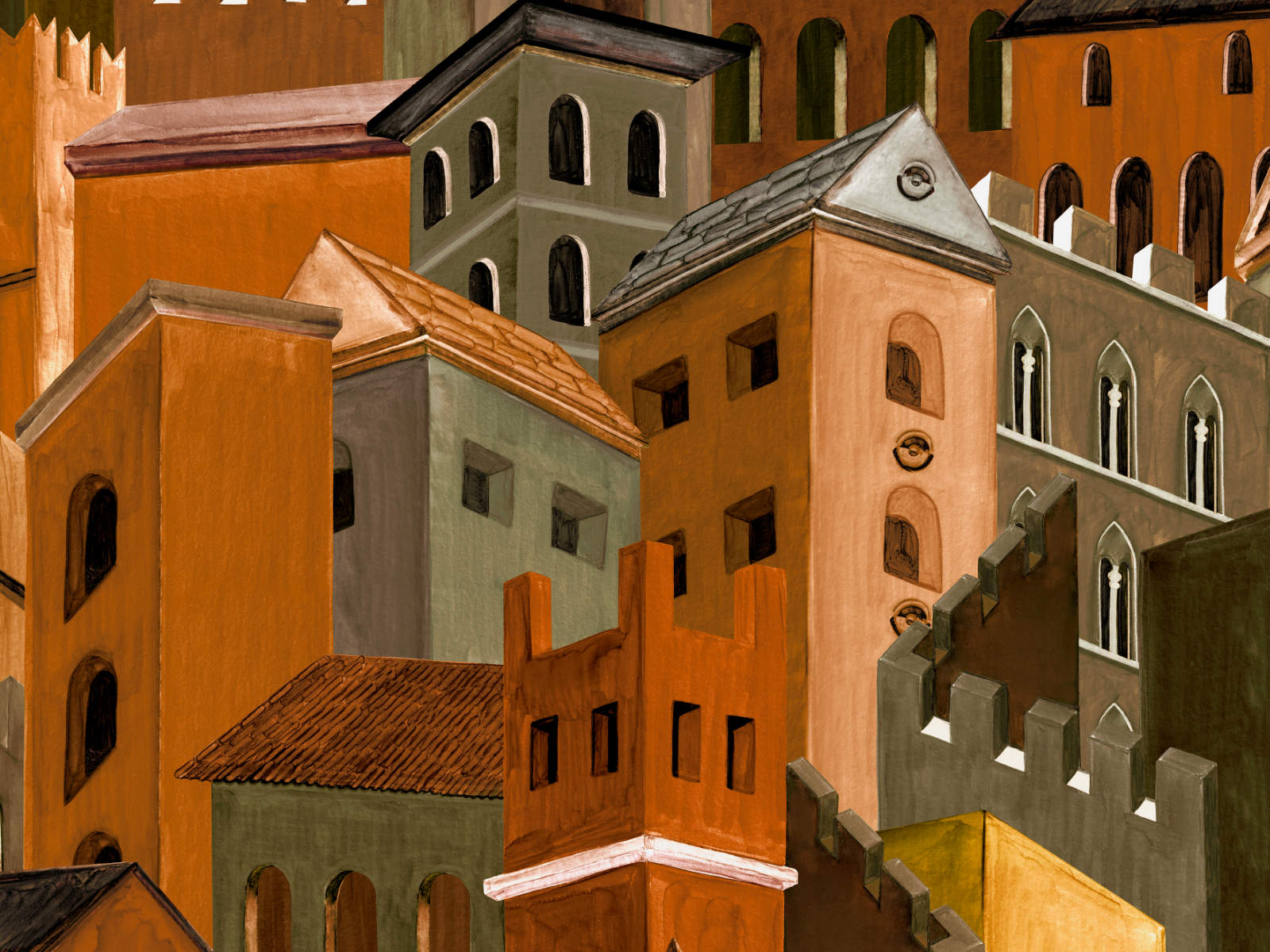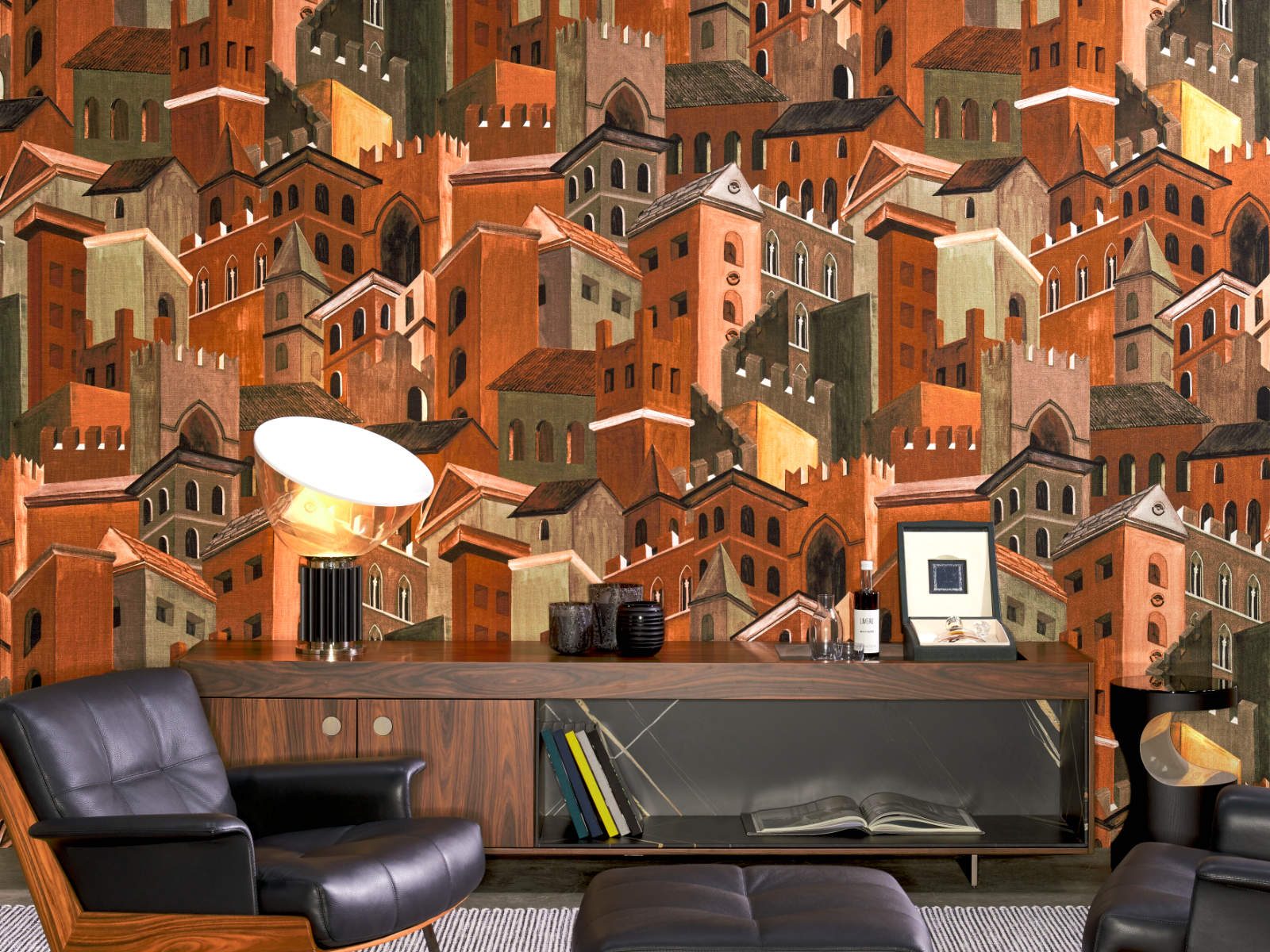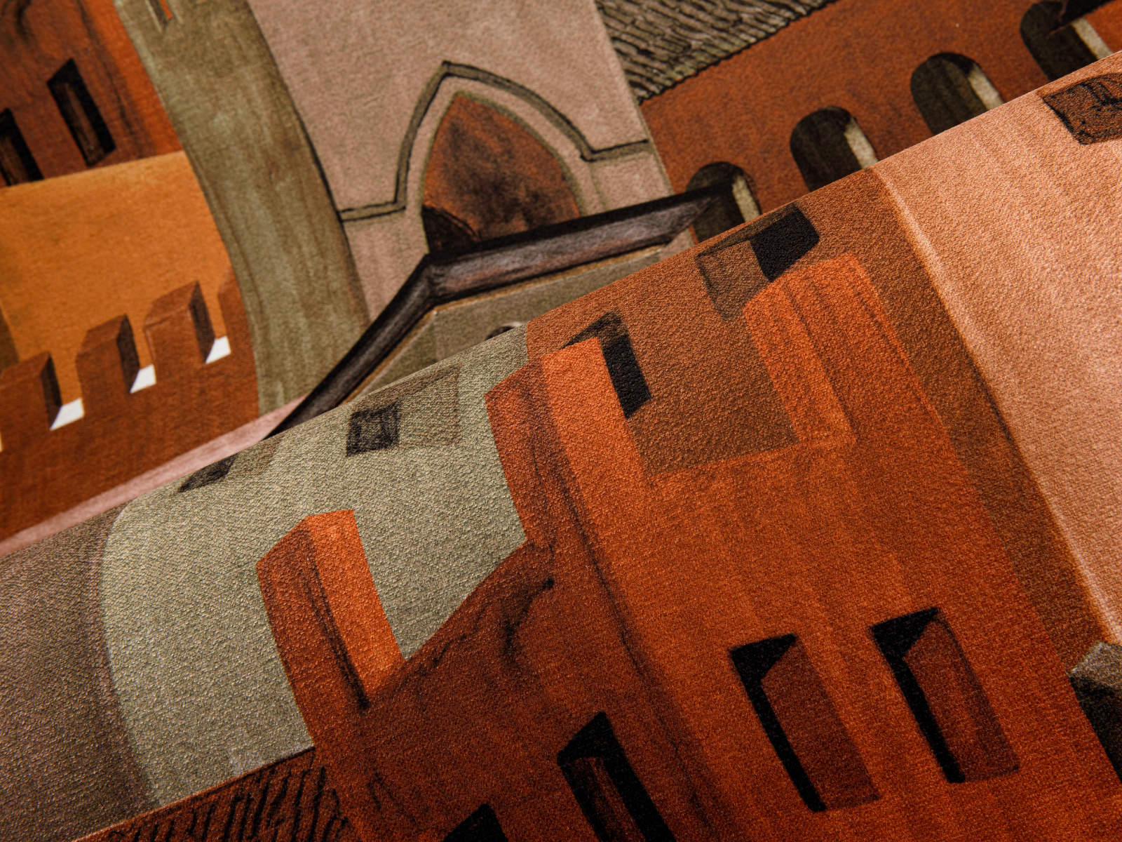De Décors & Panoramiques Citta Di Castello - 97680 van Arte behang is een speelse compositie van een stadsaanzicht van het Italiaanse Città di Castello. Het opvallende lijnenspel en kleurenpallet creëren een driedimensionaal effect. Dit decor is afgewerkt in een zachte textielstof met chenille look.