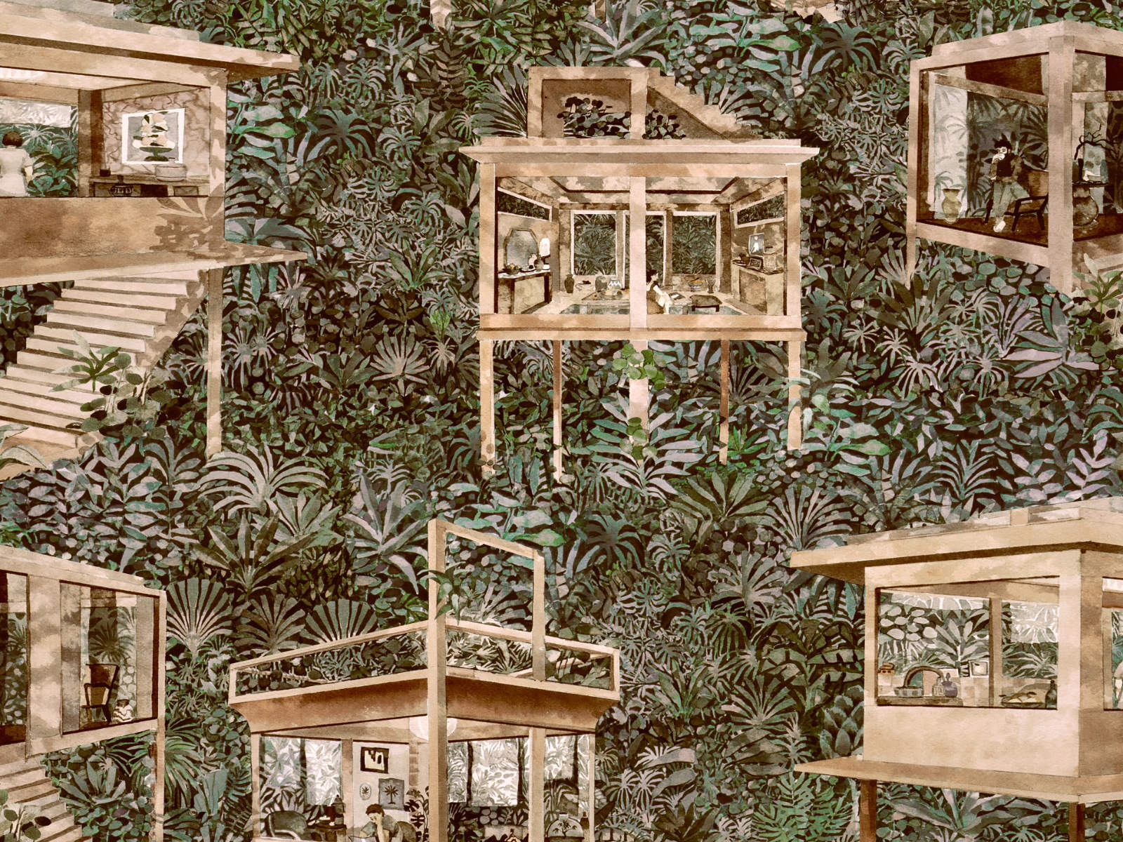 De Décors & Panoramiques Palafitas Amazonia - 97581 van Arte behang is geïnspireerd op het Franse “toile de jouy”; romantische, fleurige en lieflijke taferelen in rood of blauw op witte achtergronden. Palafitas interpreteert deze stijl van textielbedrukking op een geheel vernieuwende manier en neemt je mee naar mysterieuze paalwoningen in het Braziliaans regenwoud.