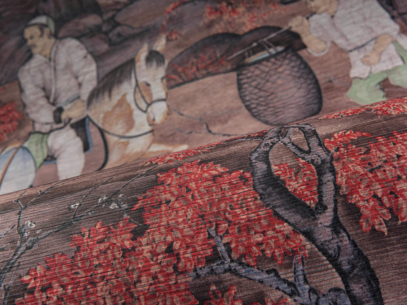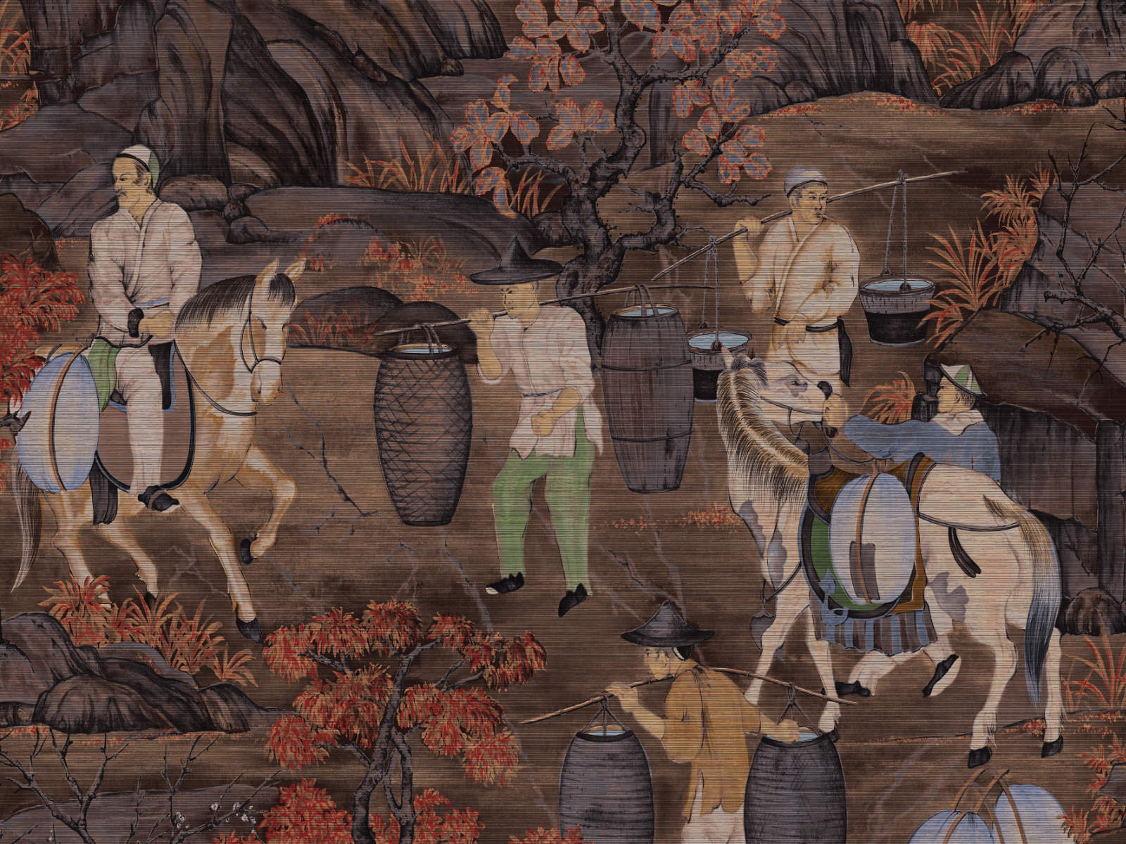 De Décors & Panoramiques Toile De Tibet - 97691 van Arte behang neemt je mee in een kleurrijk landbouwtafereel uit Tibet. Kracht en ambacht resulteren in puurheid en authenticiteit. Dit handgeschilderd decor is geprint op een horizontaal geweven textiel met een look van papierstroken. Dit zorgt voor een verweerd effect.