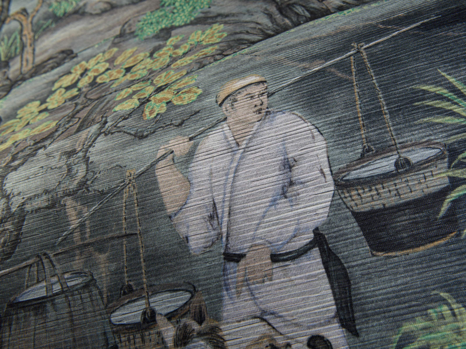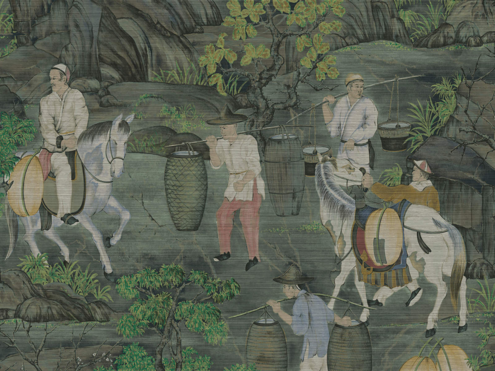De Décors & Panoramiques Toile De Tibet - 97692 van Arte behang neemt je mee in een kleurrijk landbouwtafereel uit Tibet. Kracht en ambacht resulteren in puurheid en authenticiteit. Dit handgeschilderd decor is geprint op een horizontaal geweven textiel met een look van papierstroken. Dit zorgt voor een verweerd effect.