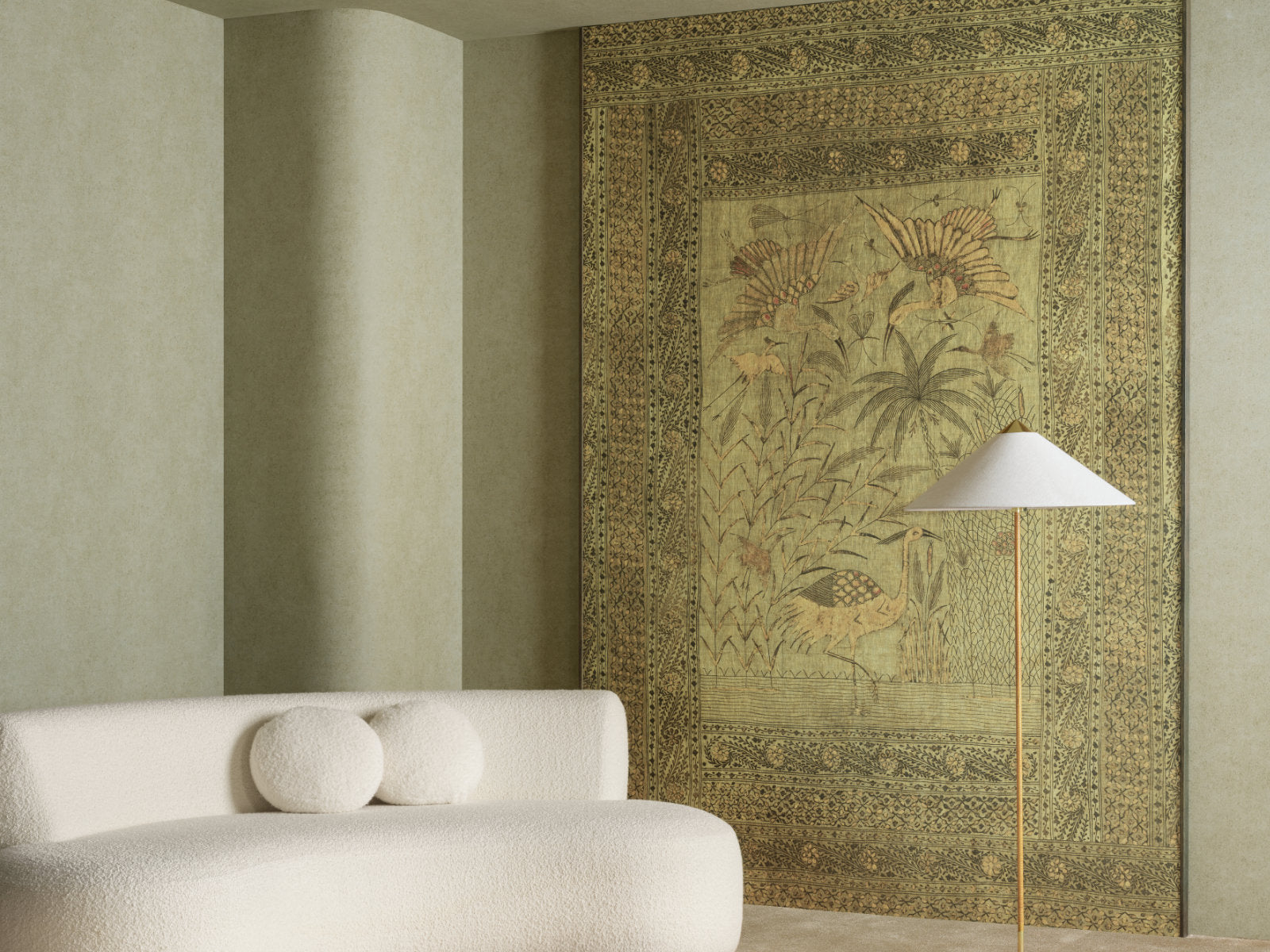 Stap binnen in een tijdloos tafereel met Arte Essentials Kaolin Passeggio, een panoramisch behang dat doet denken aan een verweerd klassiek fresco. Sierlijke kraanvogels komen tot leven op een achtergrond die lijkt op oud perkamentpapier, wat het geheel een zachte, natuurlijke uitstraling geeft met een vleugje nostalgie.