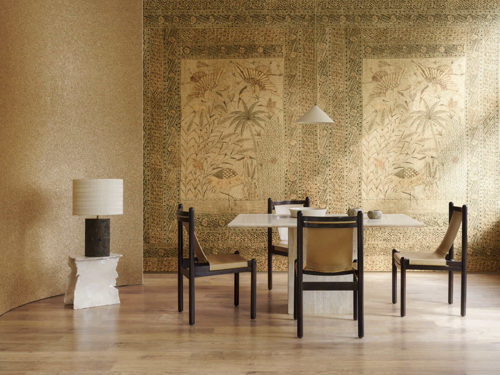 Stap binnen in een tijdloos tafereel met Arte Essentials Kaolin Passeggio, een panoramisch behang dat doet denken aan een verweerd klassiek fresco. Sierlijke kraanvogels komen tot leven op een achtergrond die lijkt op oud perkamentpapier, wat het geheel een zachte, natuurlijke uitstraling geeft met een vleugje nostalgie.