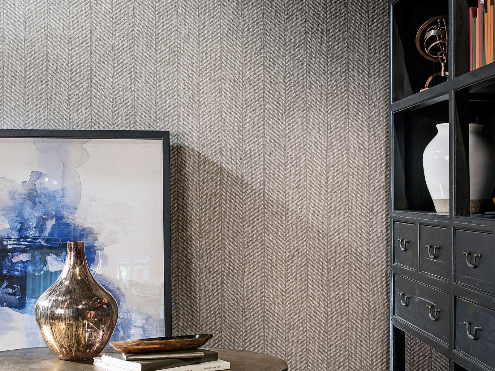 De Flamant Caractere Costume - 12023 van Arte behang is met zijn gebalanceerde patroon een echte grafische blikvanger. Het visgraatmotief, met een vleugje vintage, brengt een levendige sfeer in elke woning.