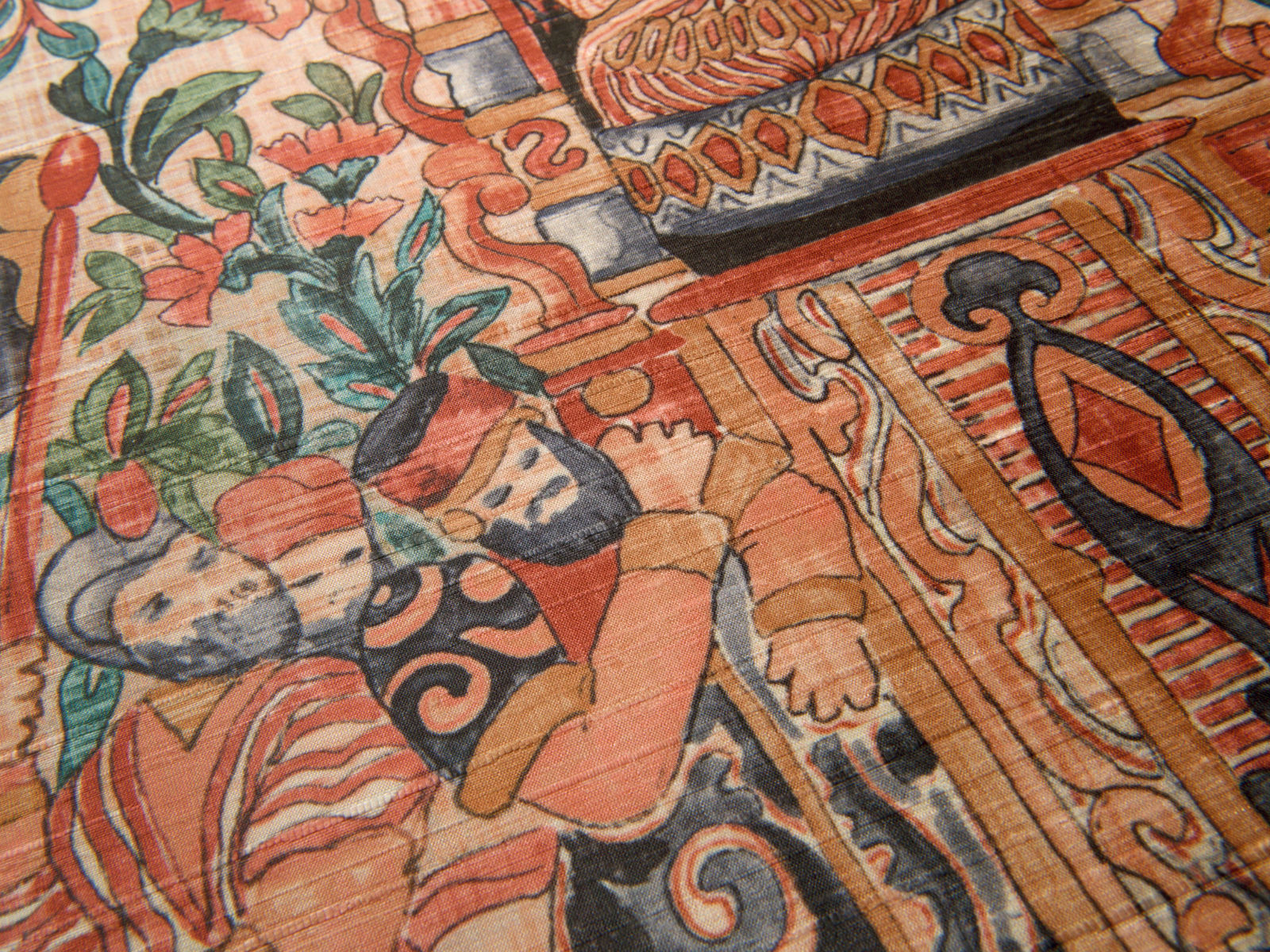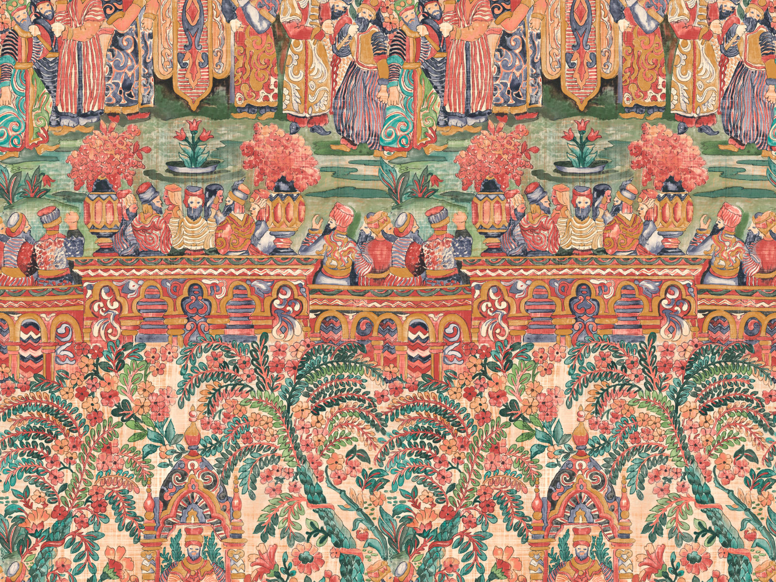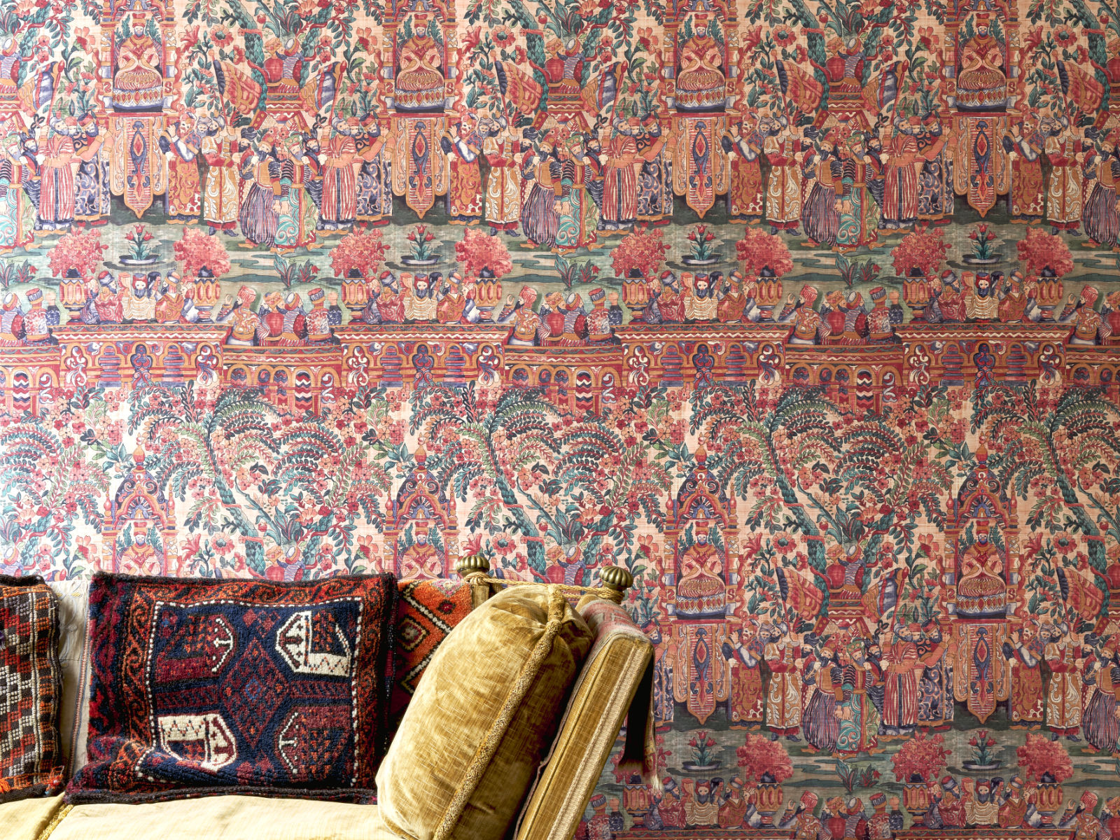 De Gitane Emperador - 49500 van Arte behang is een kleurrijk patroon dat is gebaseerd op een handschilderijdat een vrolijk tafereel uit het Ottomaanse rijk illustreert. De muurbekleding imiteert een fijne zijde. Een waar statement aan de muur!