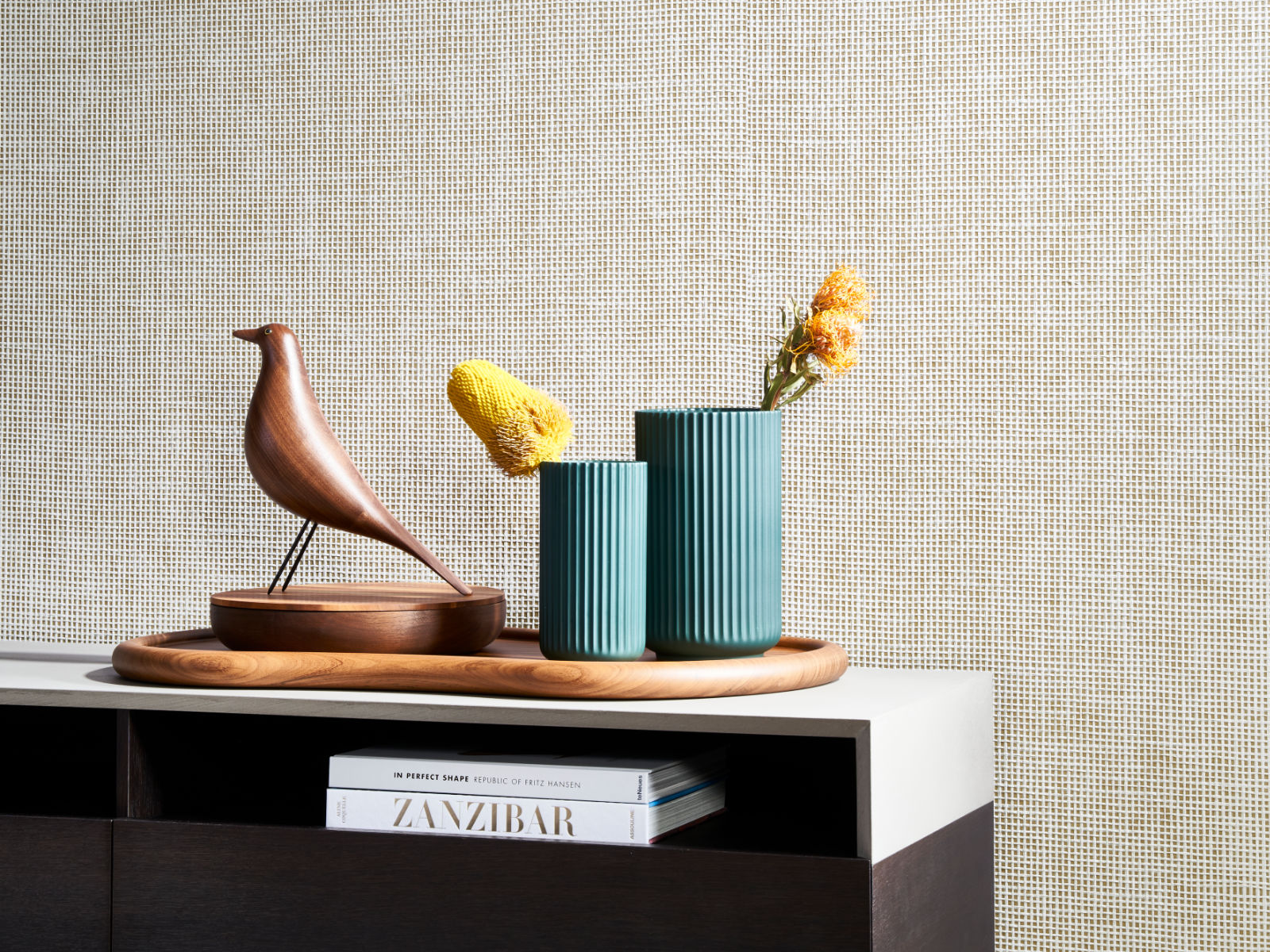 De Icons collectie charmeert door de veelzijdigheid aan materialen zoals segrijnleder, bouclé stof, metaalaccenten en rotan. Typerend aan het behang zijn de diverse geometrische patronen die een opvallend blokkenmotief naar voren schuiven. Niet alleen de warme materiaalmix is een verrassende factor, ook de variërende lichtinval en het spel van mat en glans geven een extra luxe uitstraling aan het interieur.