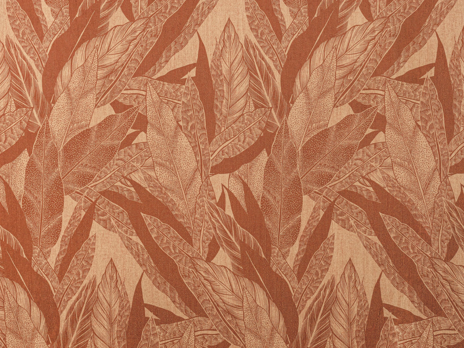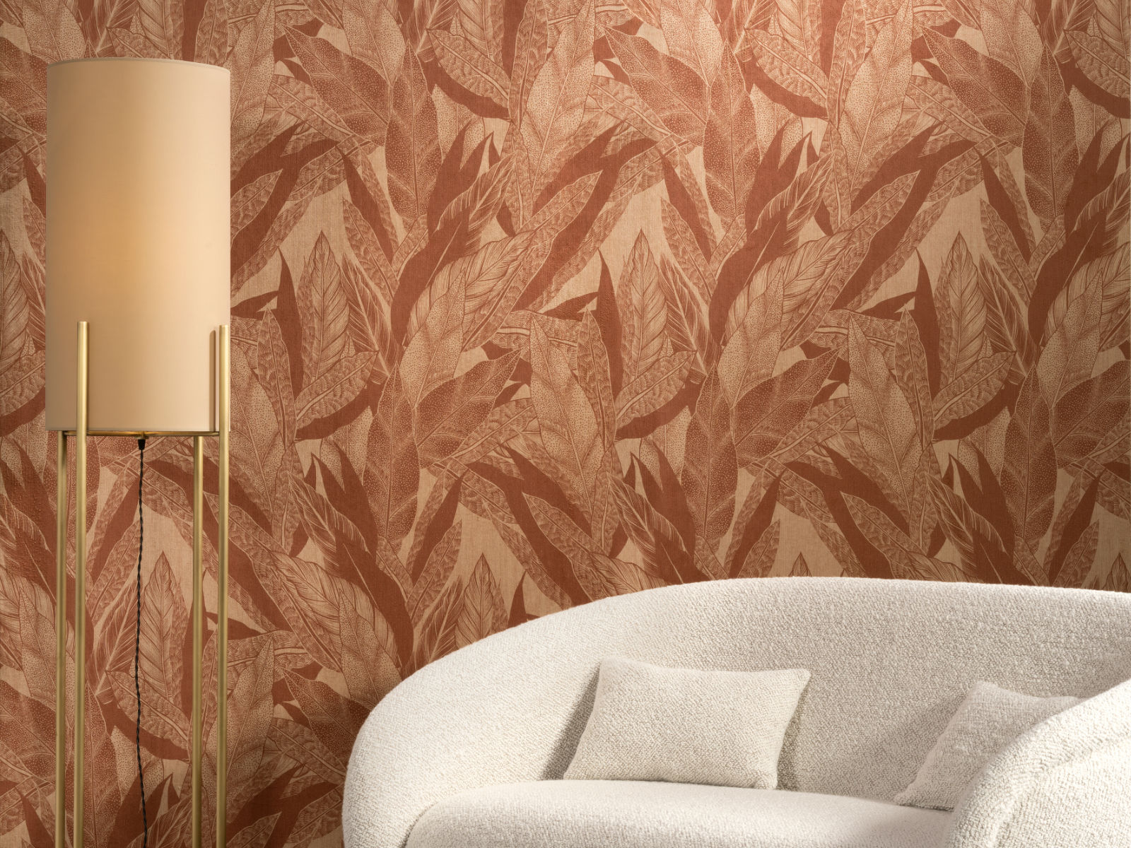 De Lush Tropicalia - 29530 van Arte behang straalt luxe, warmte en een vleugje vintage uit door de intrigerende en mysterieuze afbeelding van tropische bladeren. De rijke velvetstof met gesofistikeerde afwerking is letterlijk een streling voor het oog.