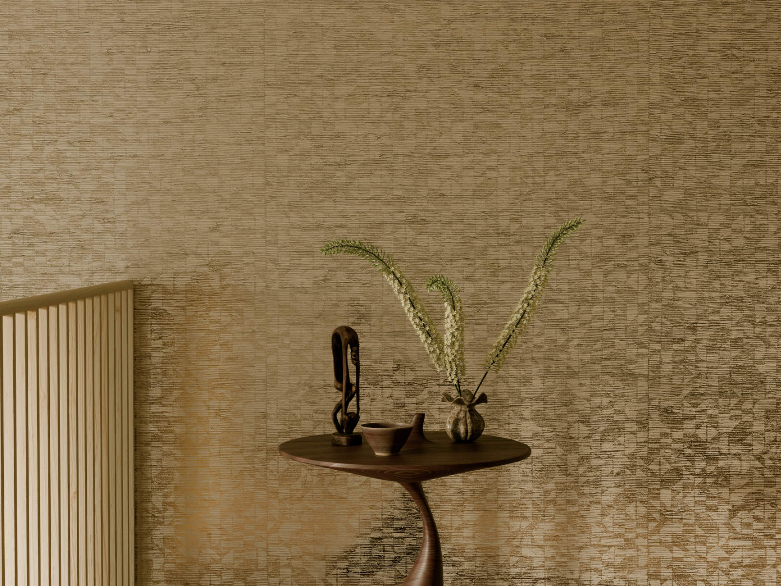 Laat je muur stralen met het exclusieve Arte Marquesa Cyperus behang. Dit verfijnde geometrische dessin is geprint op echt natuurlijk gras, waardoor elke baan een uniek karakter krijgt. De afwerking met een metaalkleurige folie geeft een subtiele glans die luxe en warmte toevoegt aan je interieur. Geïnspireerd op de Cyperus marquisensis, een exotische grassoort van de Marquesaseilanden, straalt dit behang pure verfijning uit.