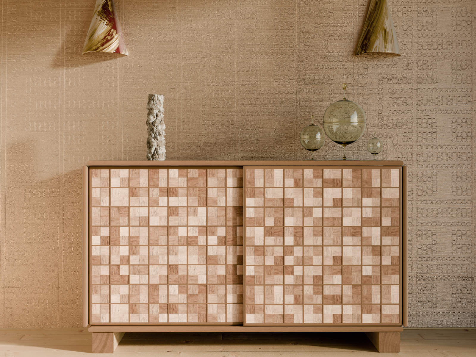Laat je meevoeren naar de mysterieuze sfeer van Polynesië met het Arte Marquesa Taio behang. Dit geometrische dessin is een subtiele knipoog naar traditioneel houtsnijwerk, met zachte, ronde vormen die met zorg zijn geborduurd op een verfijnde sisalweving. De glanzende ondergrond die elegant door de structuur heen schijnt, geeft het geheel een luxueuze en gelaagde uitstraling.