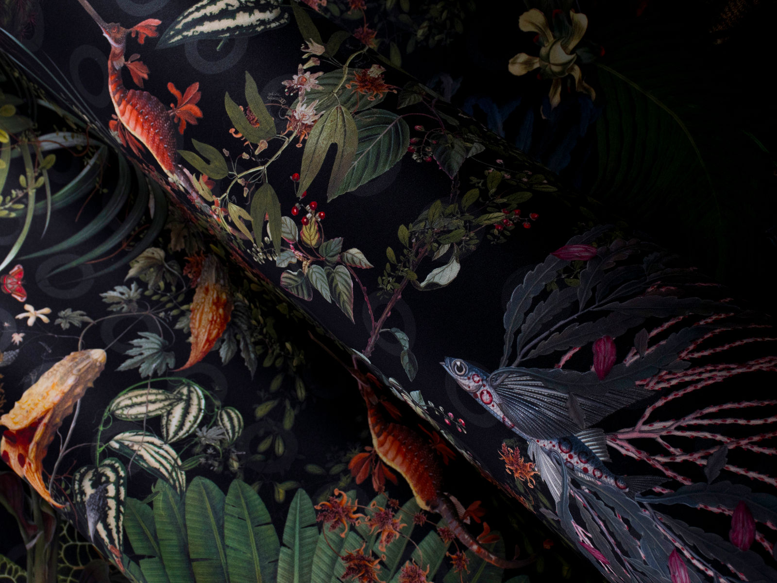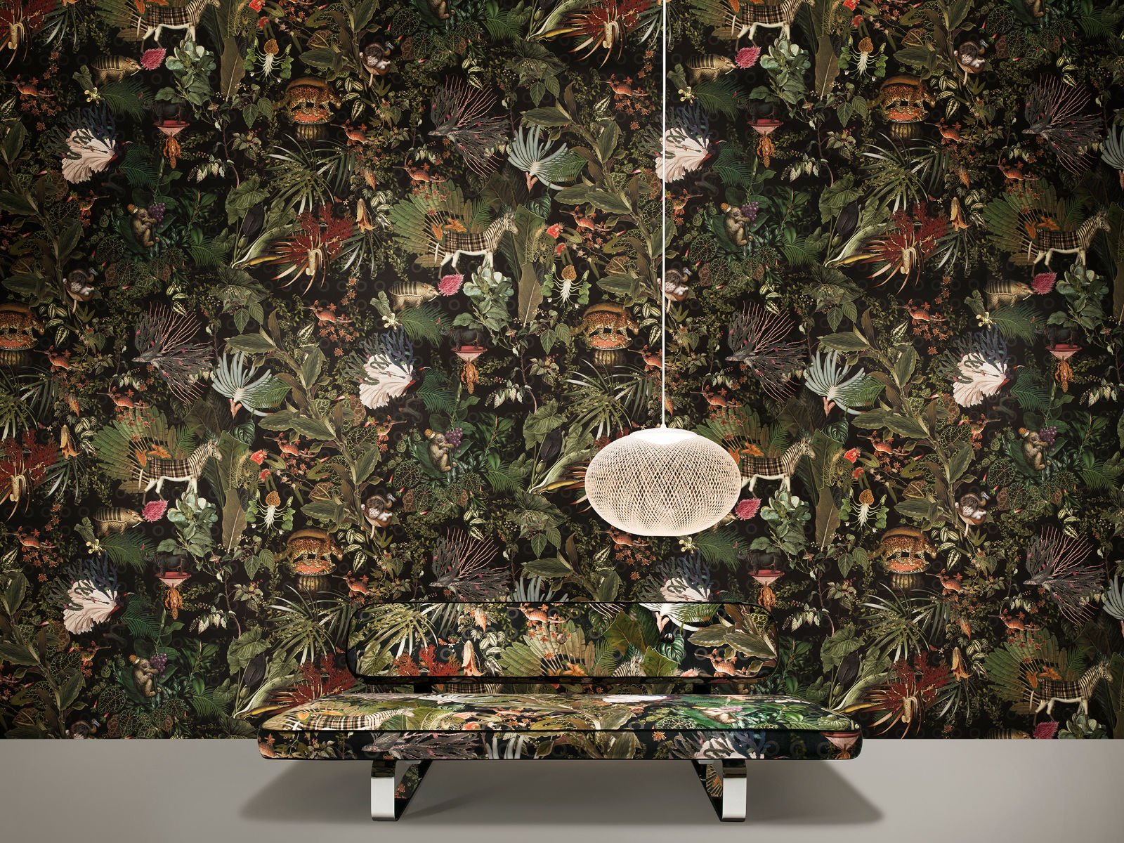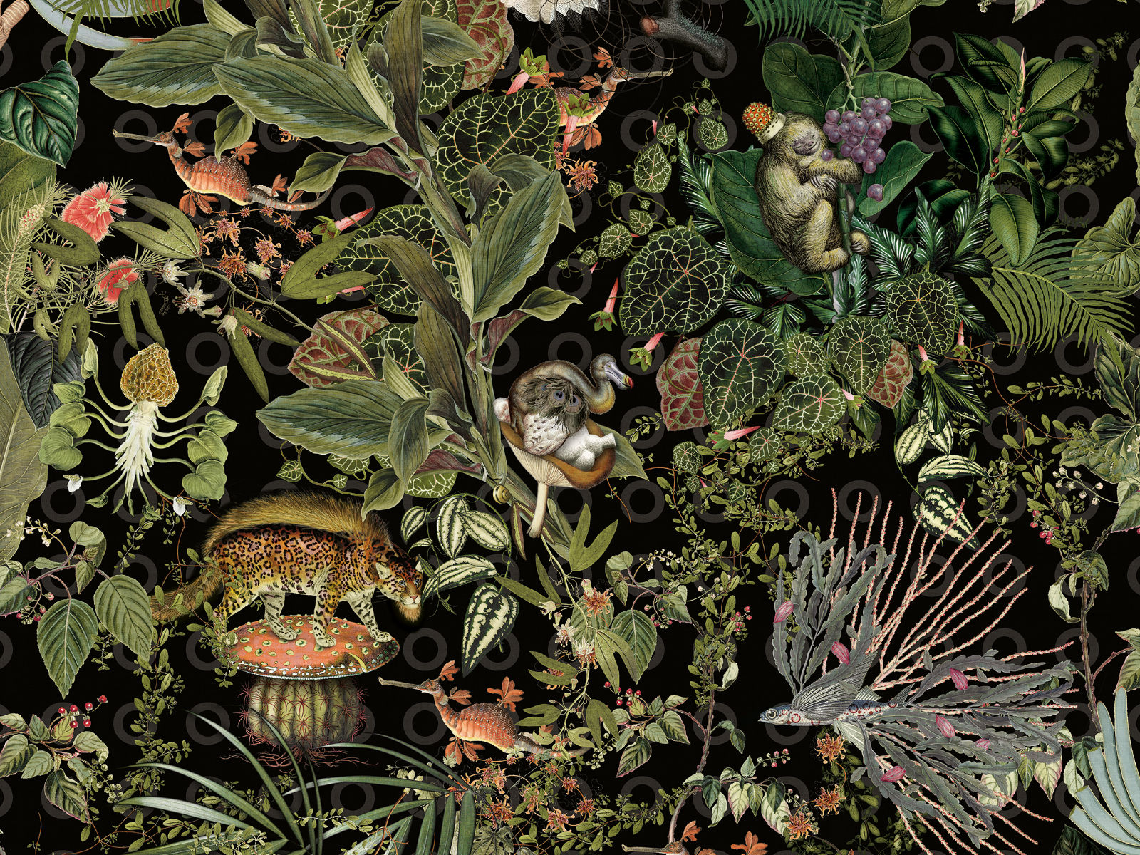 De Moooi Menagerie of Extinct Animals - Raven van Arte behang is een fantastische fauna print. Dit behang is digitaal geprint op een soft-touch textiel vlies. In totaal bestaat dit behang uit tien uitgestorven dieren die op mysterieuze wijze verborgen zitten in de print van dit behang.