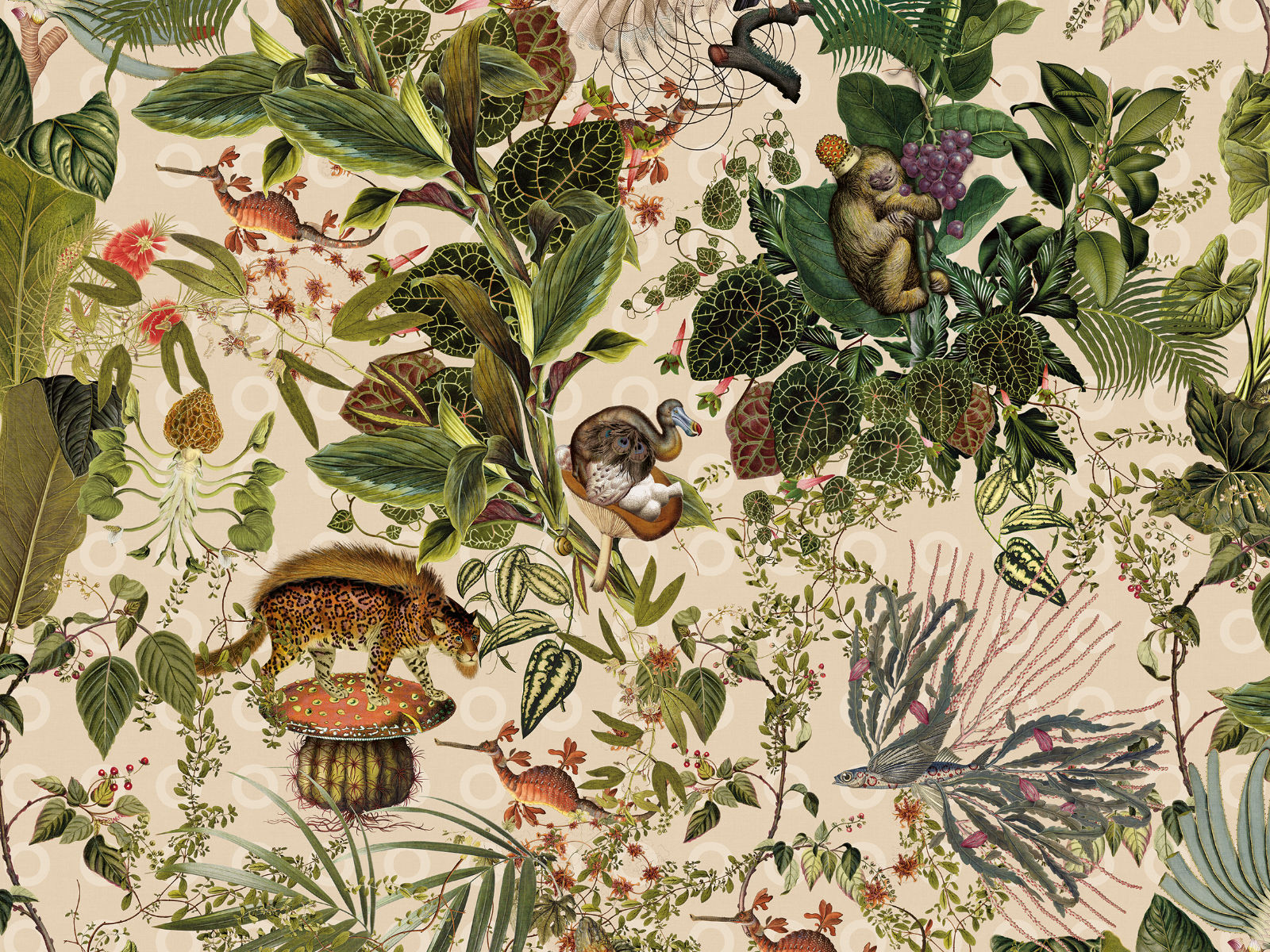De Moooi Menagerie of Extinct Animals - Ivory van Arte behang is een fantastische fauna print. Dit behang is digitaal geprint op een soft-touch textiel vlies. In totaal bestaat dit behang uit tien uitgestorven dieren die op mysterieuze wijze verborgen zitten in de print van dit behang.