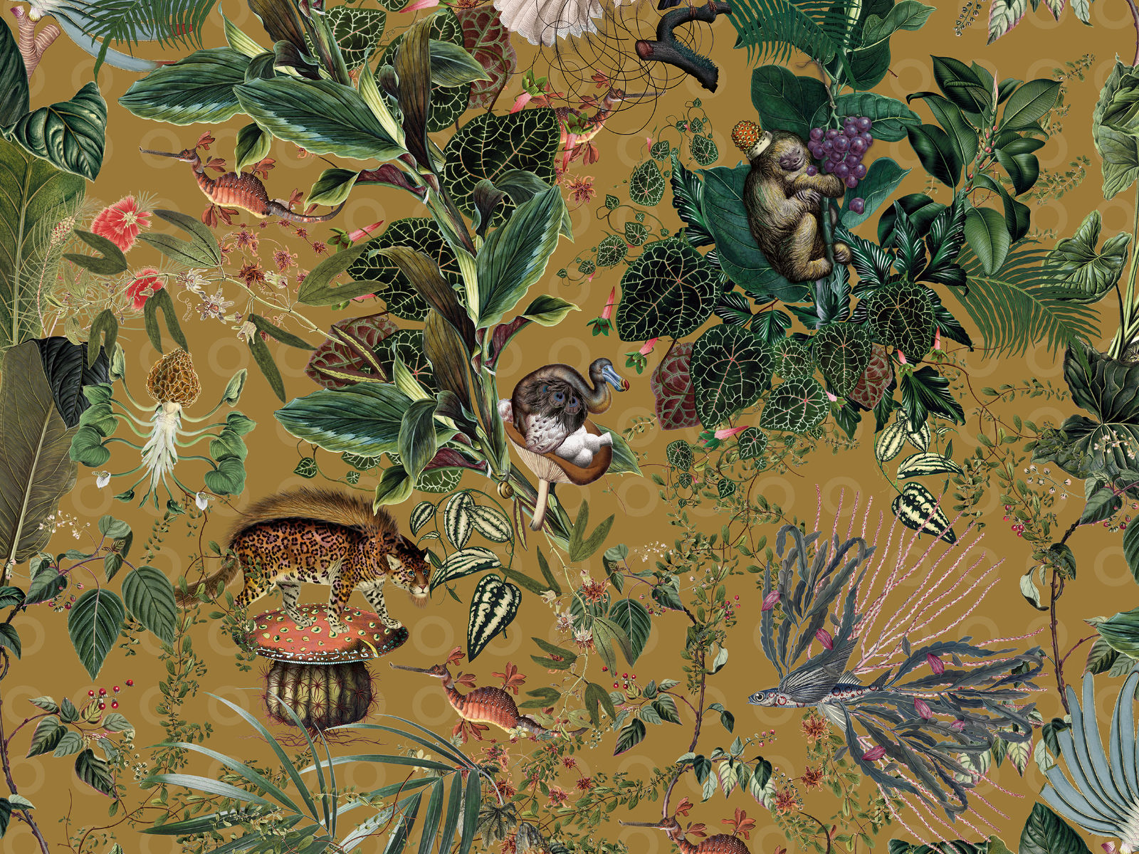De Moooi Menagerie of Extinct Animals - Curry van Arte behang is een fantastische fauna print. Dit behang is digitaal geprint op een soft-touch textiel vlies. In totaal bestaat dit behang uit tien uitgestorven dieren die op mysterieuze wijze verborgen zitten in de print van dit behang.