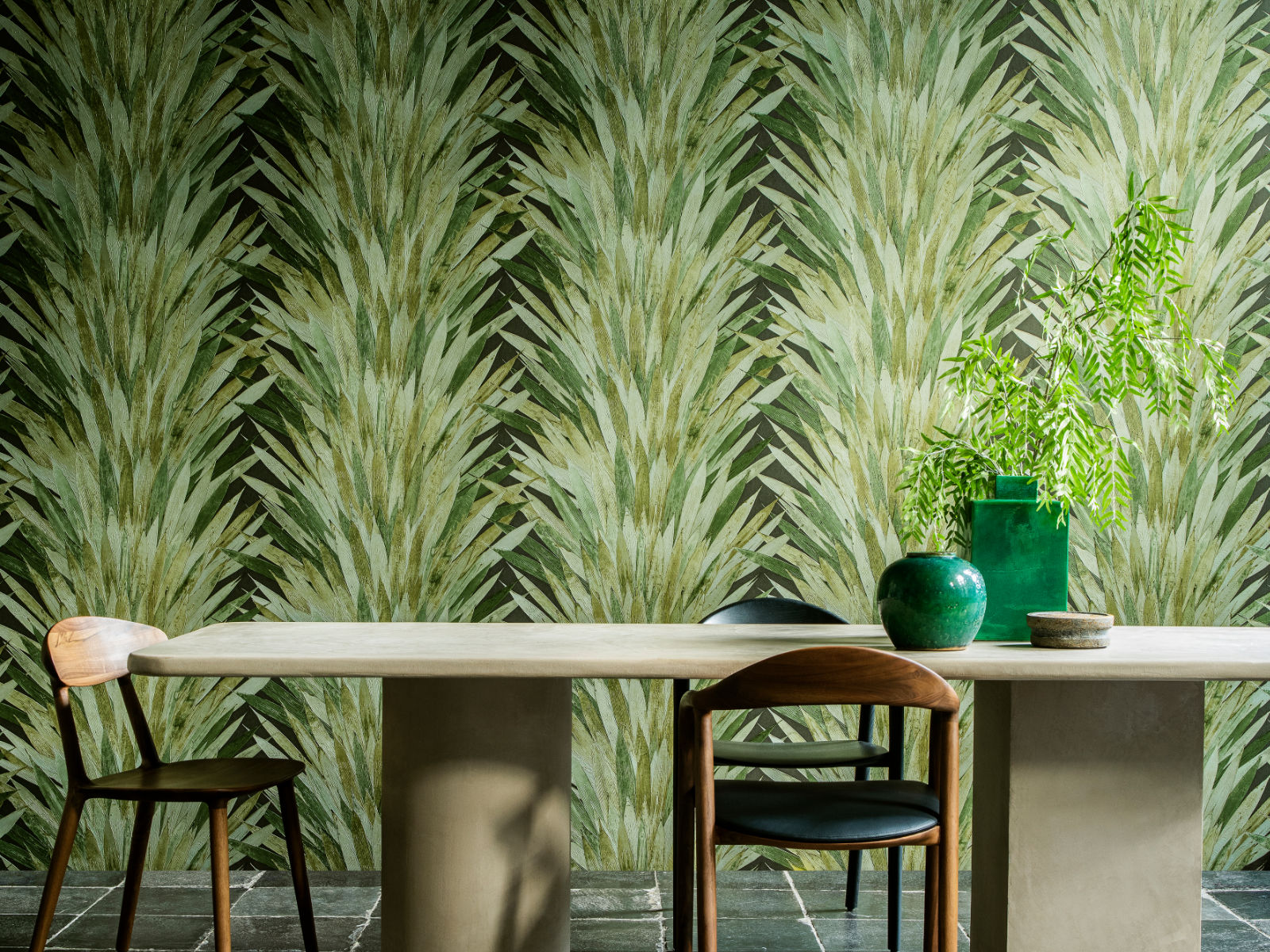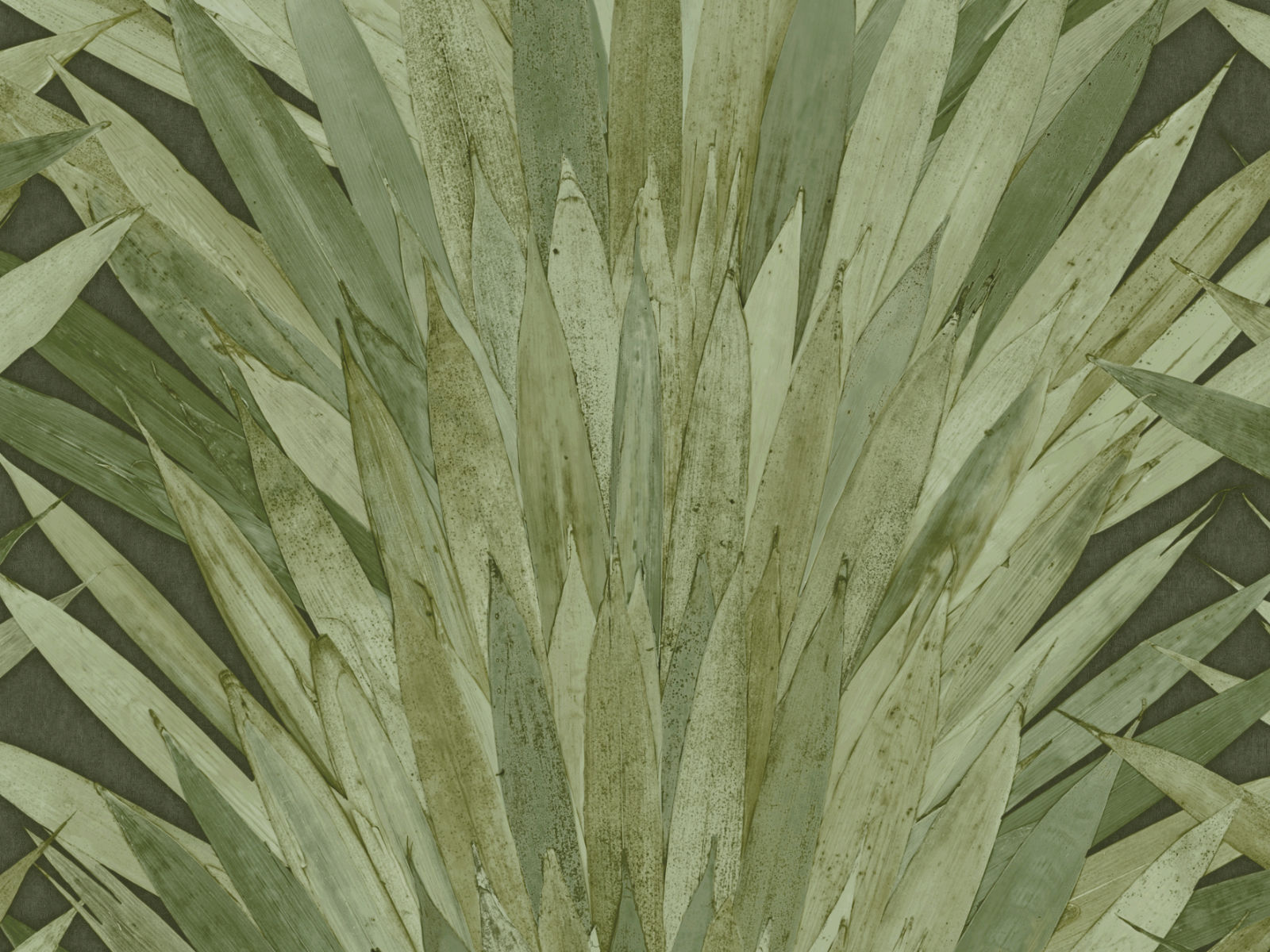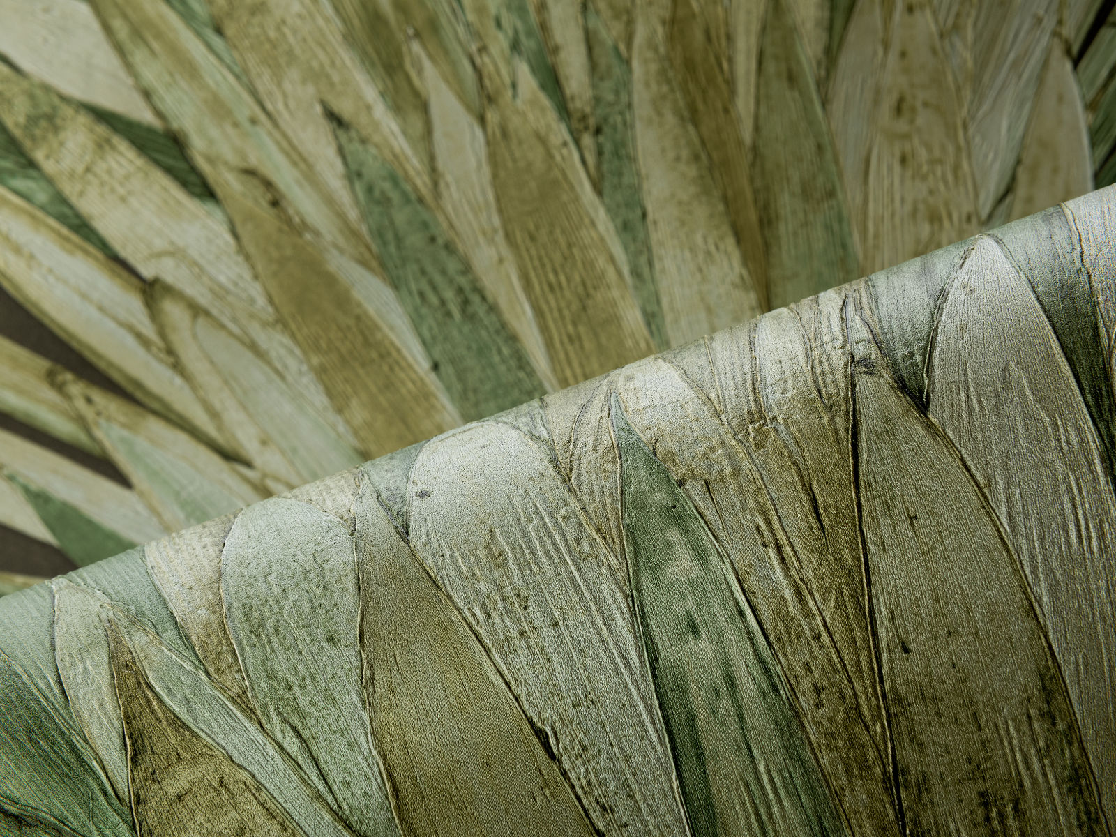 De Selva Abanico - 34001 van Arte behang wordt gevormd door een compositie van pandanbladeren in waaiervorm. Deze pandanbladeren zorgen voor een subtiele ‘collage-look’. Het uitgesproken reliëf van de tekening geeft extra diepte en contrast.