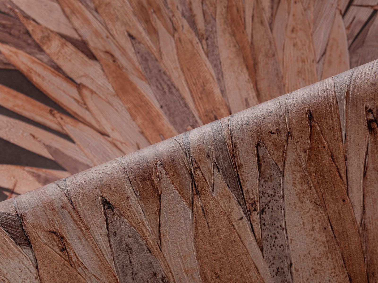 De Selva Abanico - 34003 van Arte behang wordt gevormd door een compositie van pandanbladeren in waaiervorm. Deze pandanbladeren zorgen voor een subtiele ‘collage-look’. Het uitgesproken reliëf van de tekening geeft extra diepte en contrast.