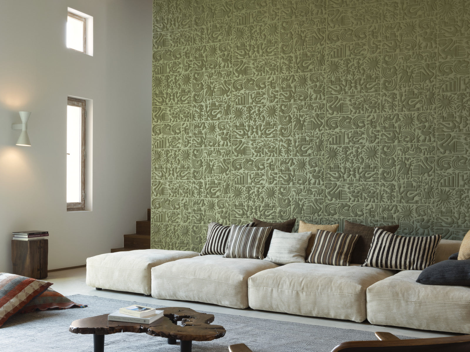 Uitgevoerd in luxe textiel op vlies, met een patroonhoogte van 95 cm en een verspringende aanzet, creëer je met Chimu moeiteloos een wand die blijft fascineren. Verkrijgbaar in vijf karaktervolle kleuren is dit dessin ideaal voor wie durft te kiezen voor een uitgesproken en cultureel geïnspireerde look met voelbare structuur.