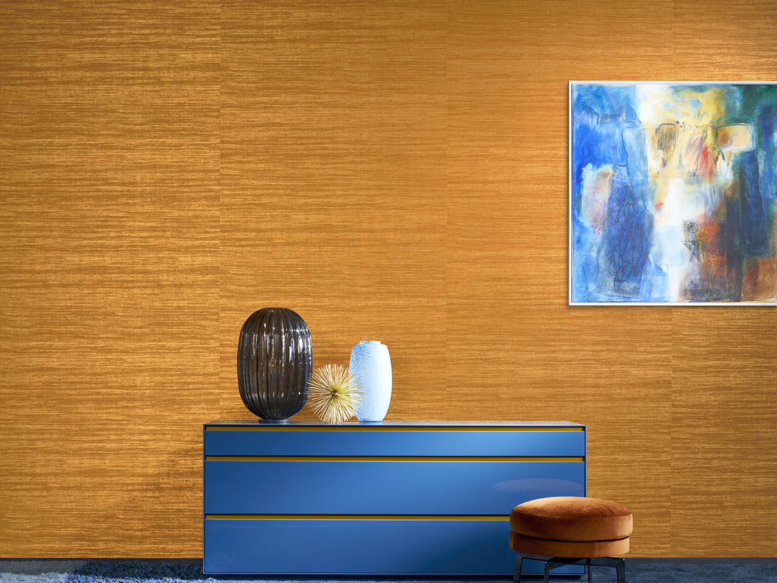 De Textura Eri - 72050A van Arte behang maakt van elke wand een uniek object. Pure luxe. Geïnspireerd op een open geweven zijde en aangebracht op een ondergrond van kostbare hoogglansfolie. De warme gloed van het edelmetaal schijnt door de fijne mazen van de stof welke zorgen voor een meer uitgesproken en exclusieve uitstraling.