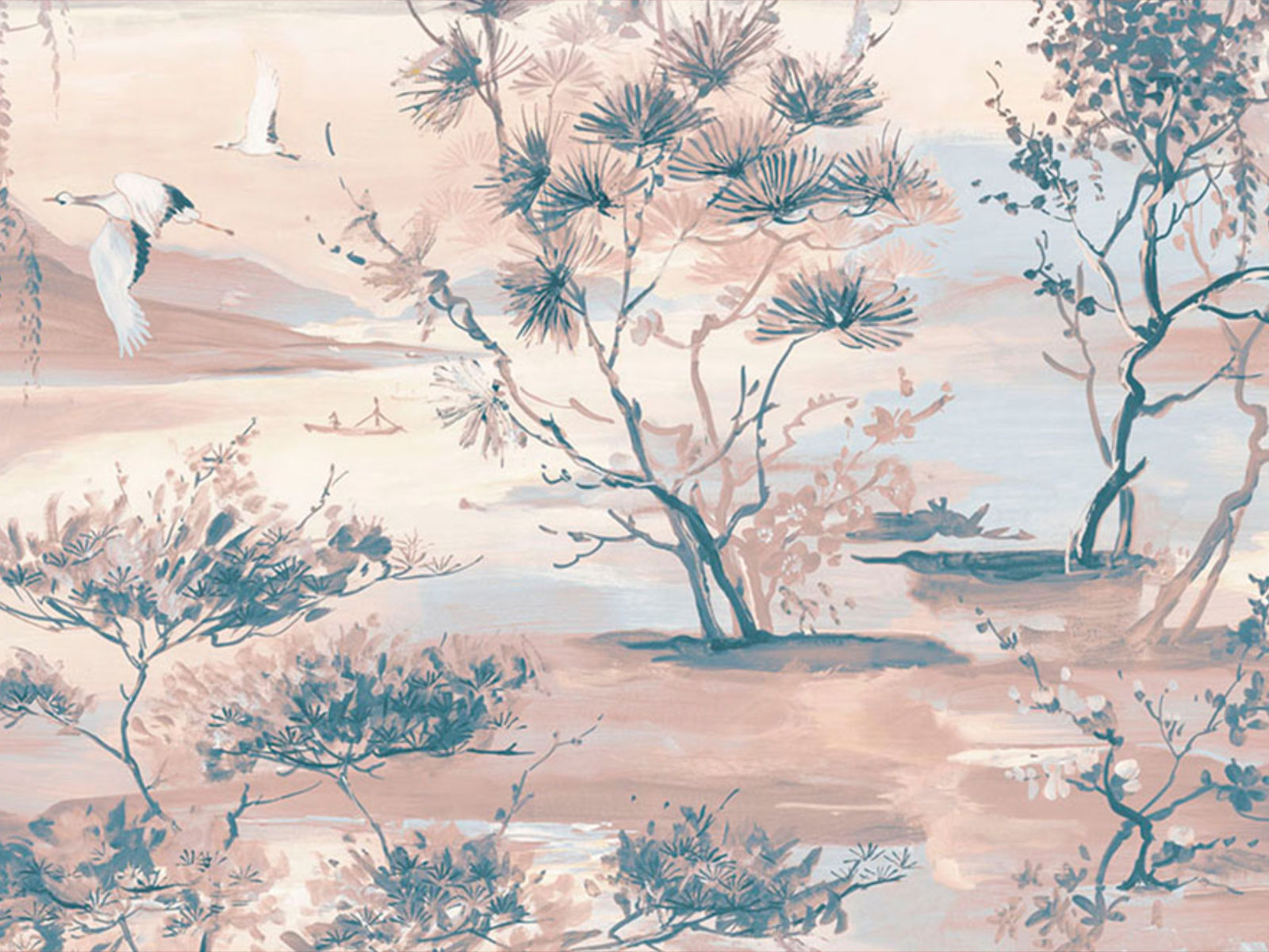 De Yumiko Sagimai - 6011 van Arte behang is een toile-achtig motief met prachtig bloeiende bomen, gelaagde bergtoppen en kraanvogels op de vlucht. Het grasweefsel in het behang geeft een voelbare structuur en benadrukt de Japanse uitstraling. De wandbekleding krijgt een subtiele glans als er licht op valt.