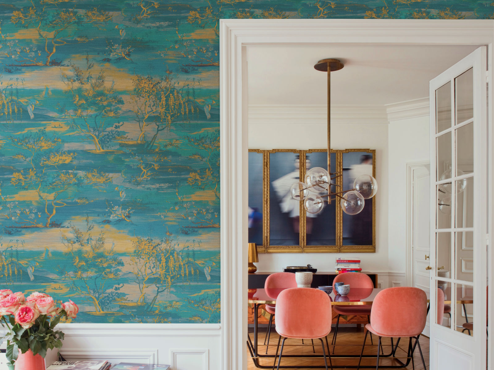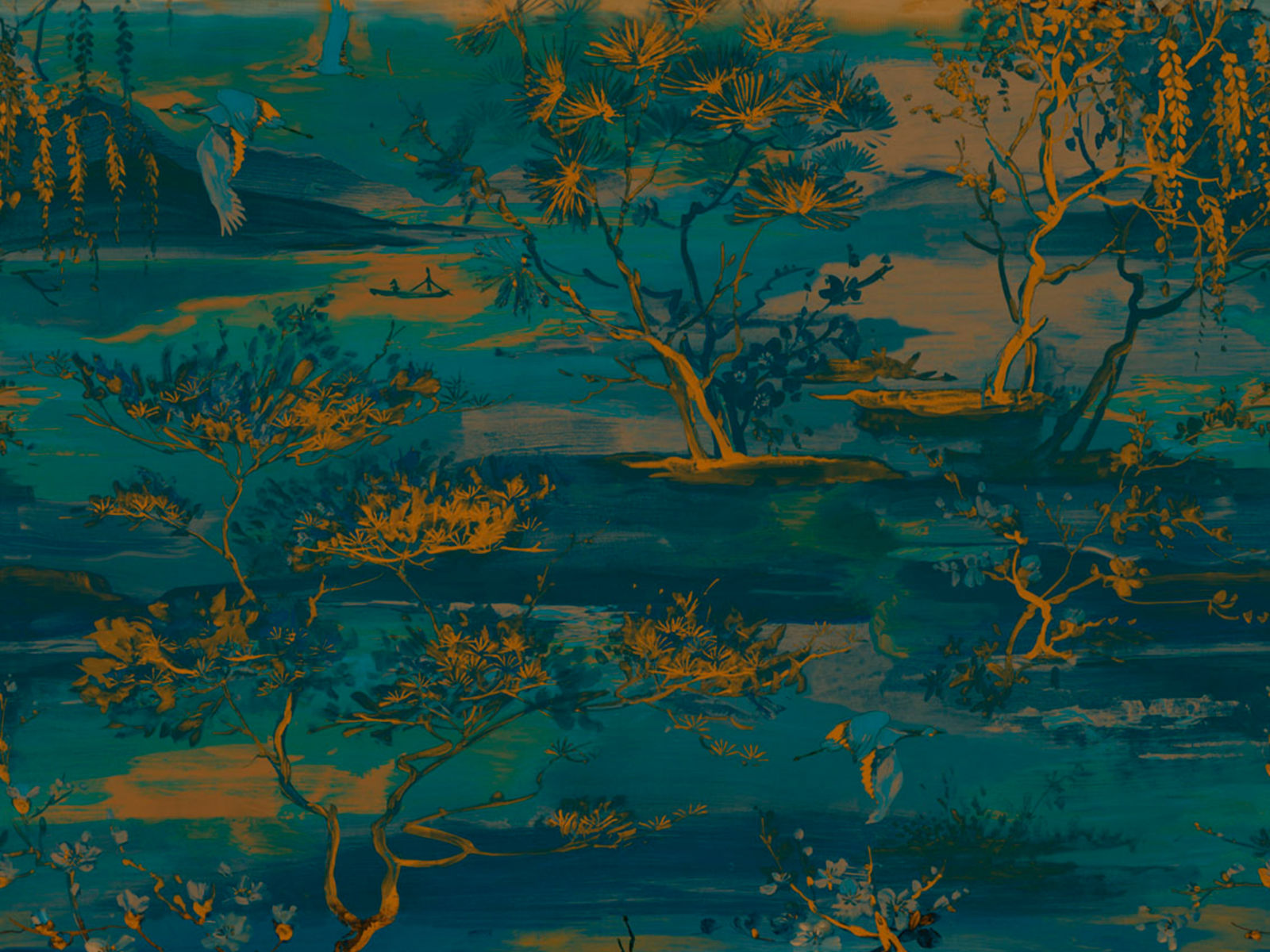 De Yumiko Sagimai - 6014 van Arte behang is een toile-achtig motief met prachtig bloeiende bomen, gelaagde bergtoppen en kraanvogels op de vlucht. Het grasweefsel in het behang geeft een voelbare structuur en benadrukt de Japanse uitstraling. De wandbekleding krijgt een subtiele glans als er licht op valt.