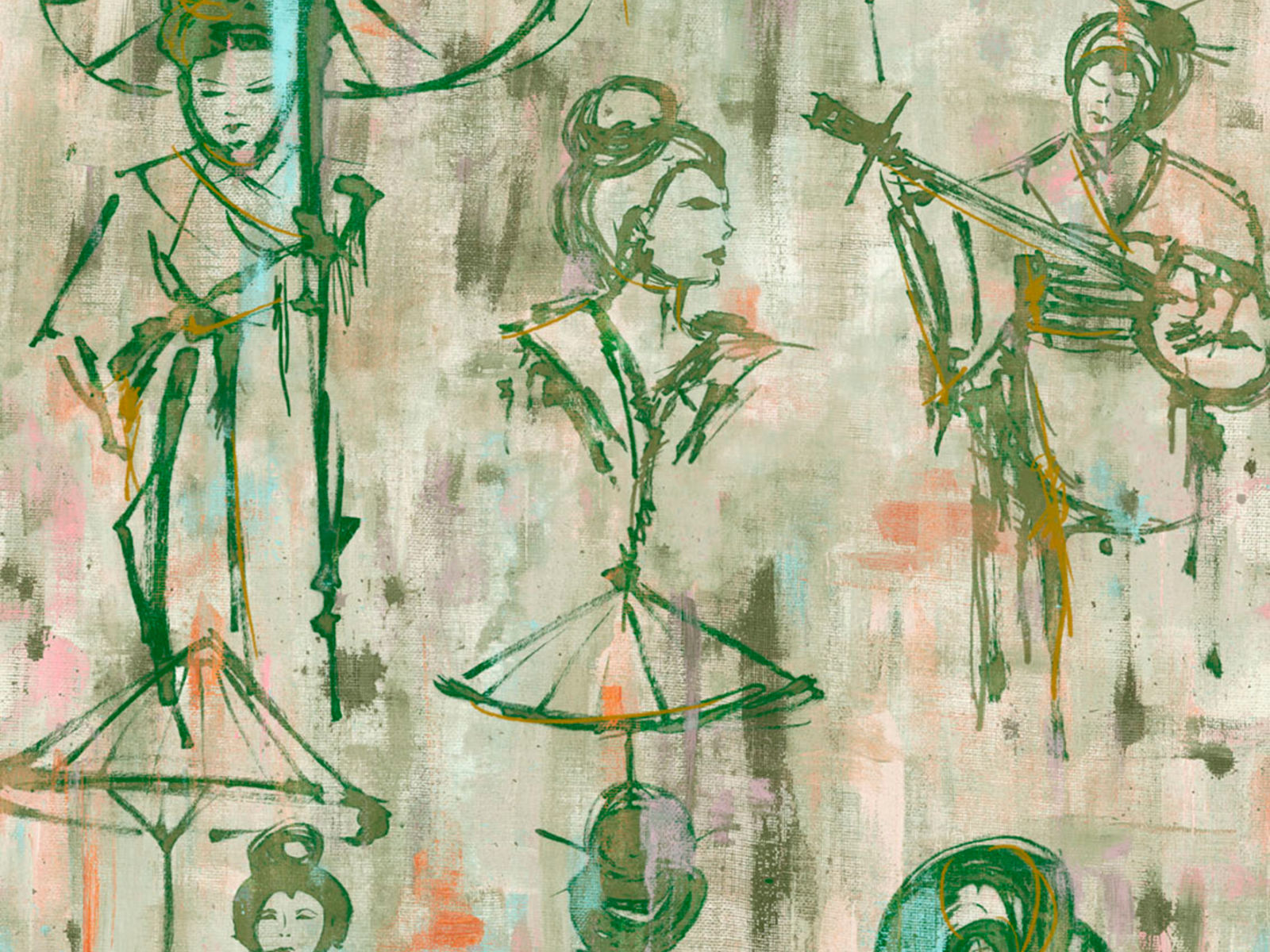 De Yumiko Yumiko - 6002 van Arte behang toont portretten van Japanse geisha's met paraplu's en zwaarden. Het grasweefsel in het behang geeft een voelbare structuur en benadrukt de Japanse uitstraling. De wandbekleding krijgt een subtiele glans als er licht op valt.