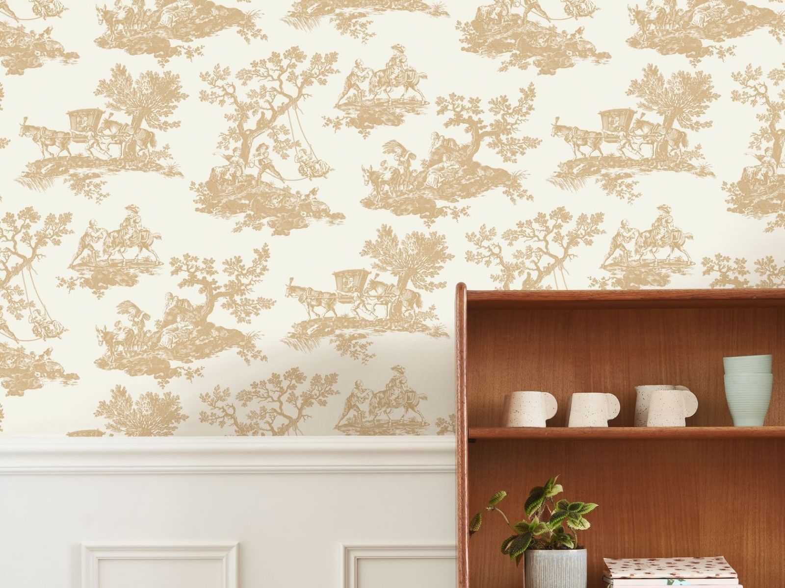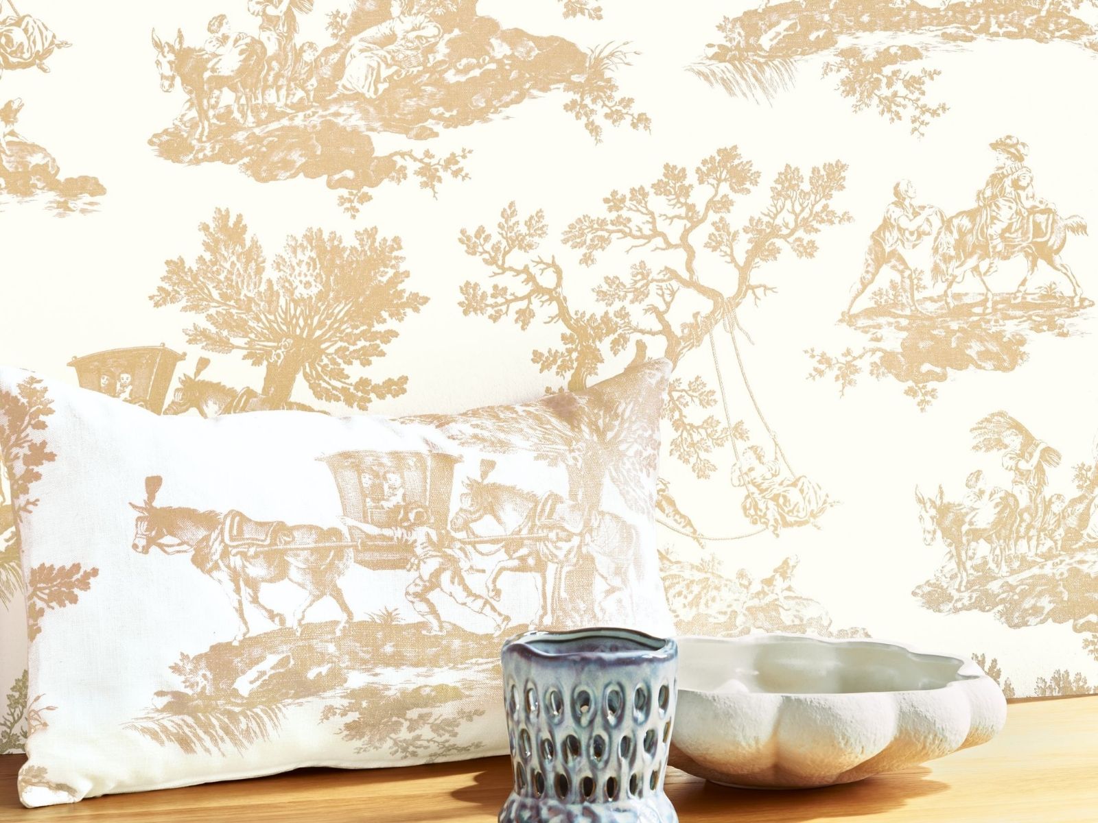Laat je meevoeren in het ritme van het platteland met het behang Cadence uit de Les Belles Toiles De Jouy 2 collectie van Casadeco. Dit elegante vliesbehang toont levendige taferelen van schommelende figuren, galopperende paarden en oogstende boeren, geïnspireerd op historische Indiase dessins. De landelijke illustraties, rechtstreeks uit het Casadeco-archief, krijgen een moderne twist en brengen dynamiek en nostalgie samen op je muur.