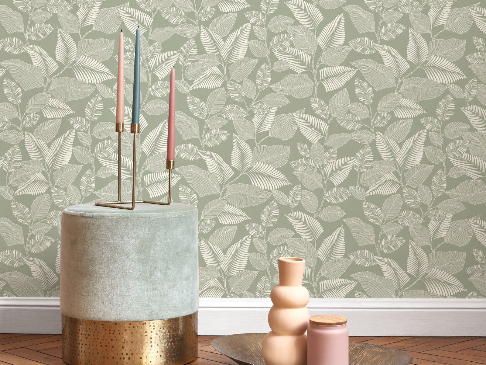 Stap binnen in een tropisch paradijs met het botanische behang Casadeco Rio Paraty. Geïnspireerd door het weelderige groen van de Braziliaanse regenwouden rondom Paraty, dompelt dit vliesbehang je kamer onder in een oase van natuurlijke rust en levendigheid. Het patroon van sierlijke bladeren en verstrengelde ranken brengt direct sfeer en diepte aan je muur.