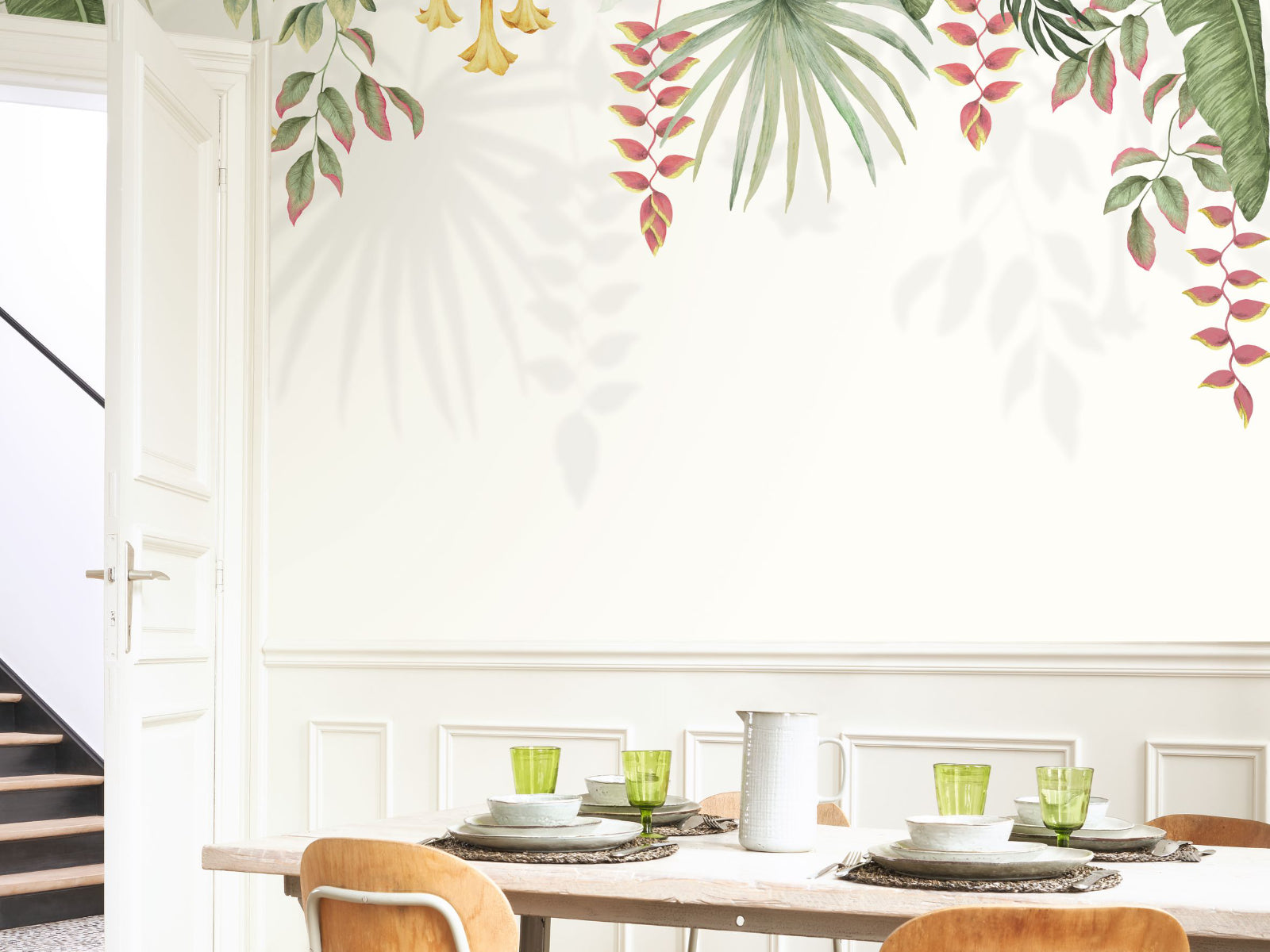 Met een breedte van 300 cm is dit vliesbehang ideaal voor grote muren in de woon- of slaapkamer. Combineer het met Scandinavisch design en lichte materialen voor een stijlvol contrast tussen tropisch en minimalistisch.
