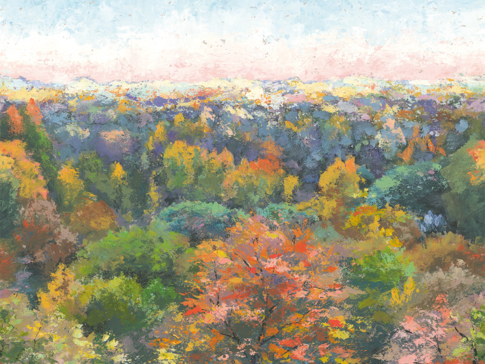Haal het gevoel van een warme herfstdag in huis met Casadeco WonderWalls Indian Summer. Van bovenaf kijk je uit over een majestueus woud in volle herfsttooi. Vegen gouache brengen bomen, bladeren en wuivend gras tot leven en geven je muur een betoverende diepte.