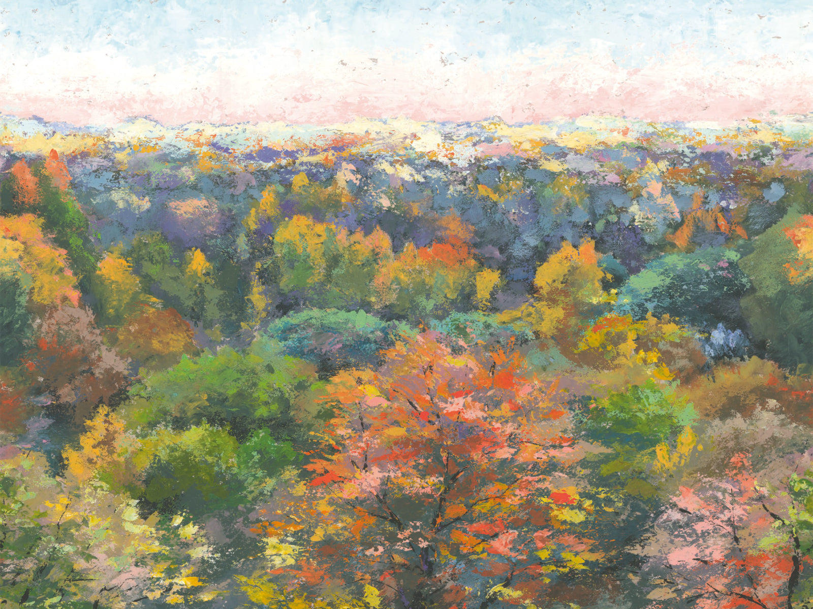 Haal het gevoel van een warme herfstdag in huis met Casadeco WonderWalls Indian Summer. Van bovenaf kijk je uit over een majestueus woud in volle herfsttooi. Vegen gouache brengen bomen, bladeren en wuivend gras tot leven en geven je muur een betoverende diepte.