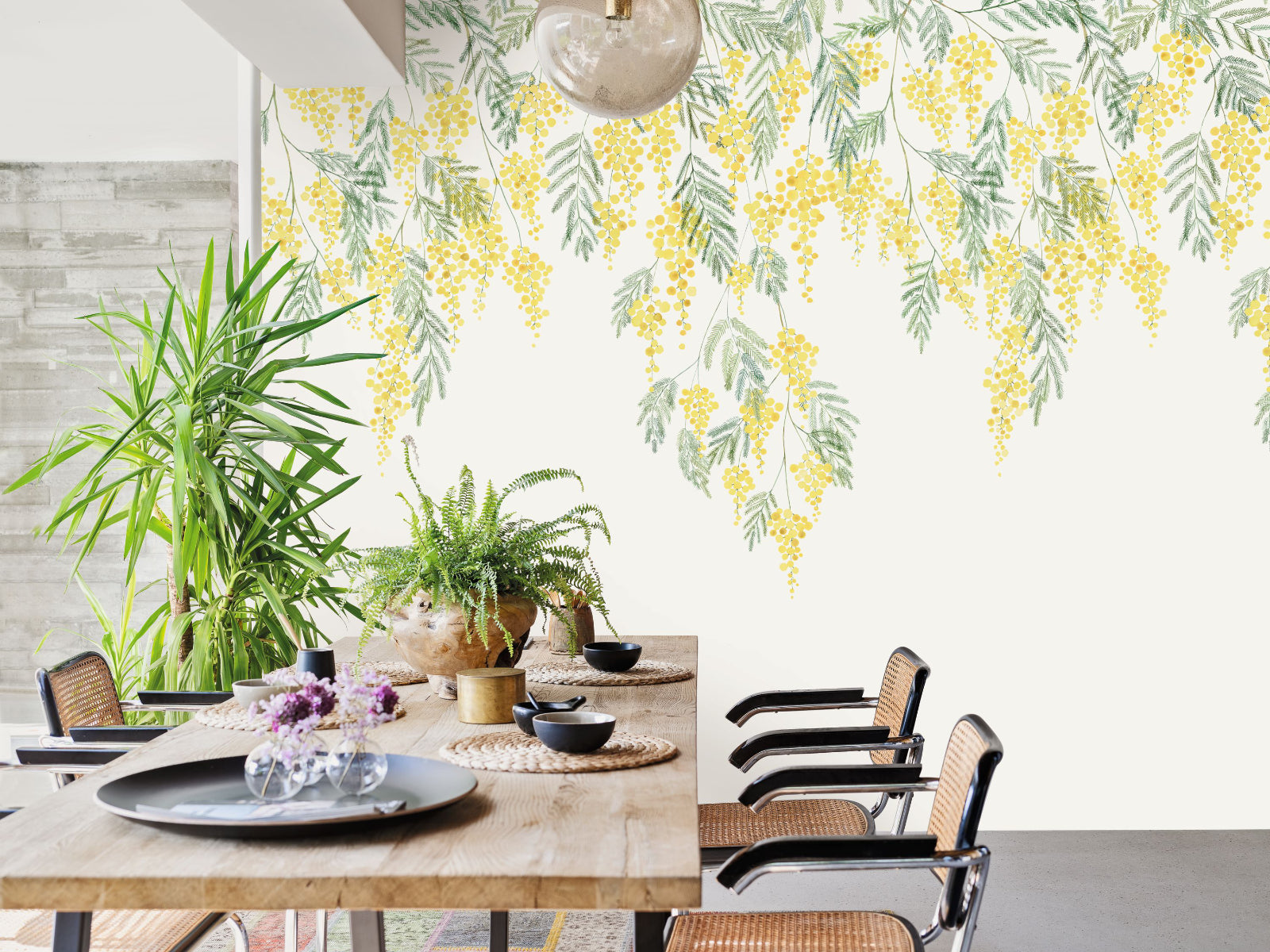 Breng de zon in huis met Casadeco WonderWalls Mimosa. Dit vrolijke behang toont een waterval van mimosatakken met hun kenmerkende gele bolletjes, alsof je je midden in een mediterrane tuin bevindt. Je zou bijna de geur van bloeiende struiken kunnen ruiken.