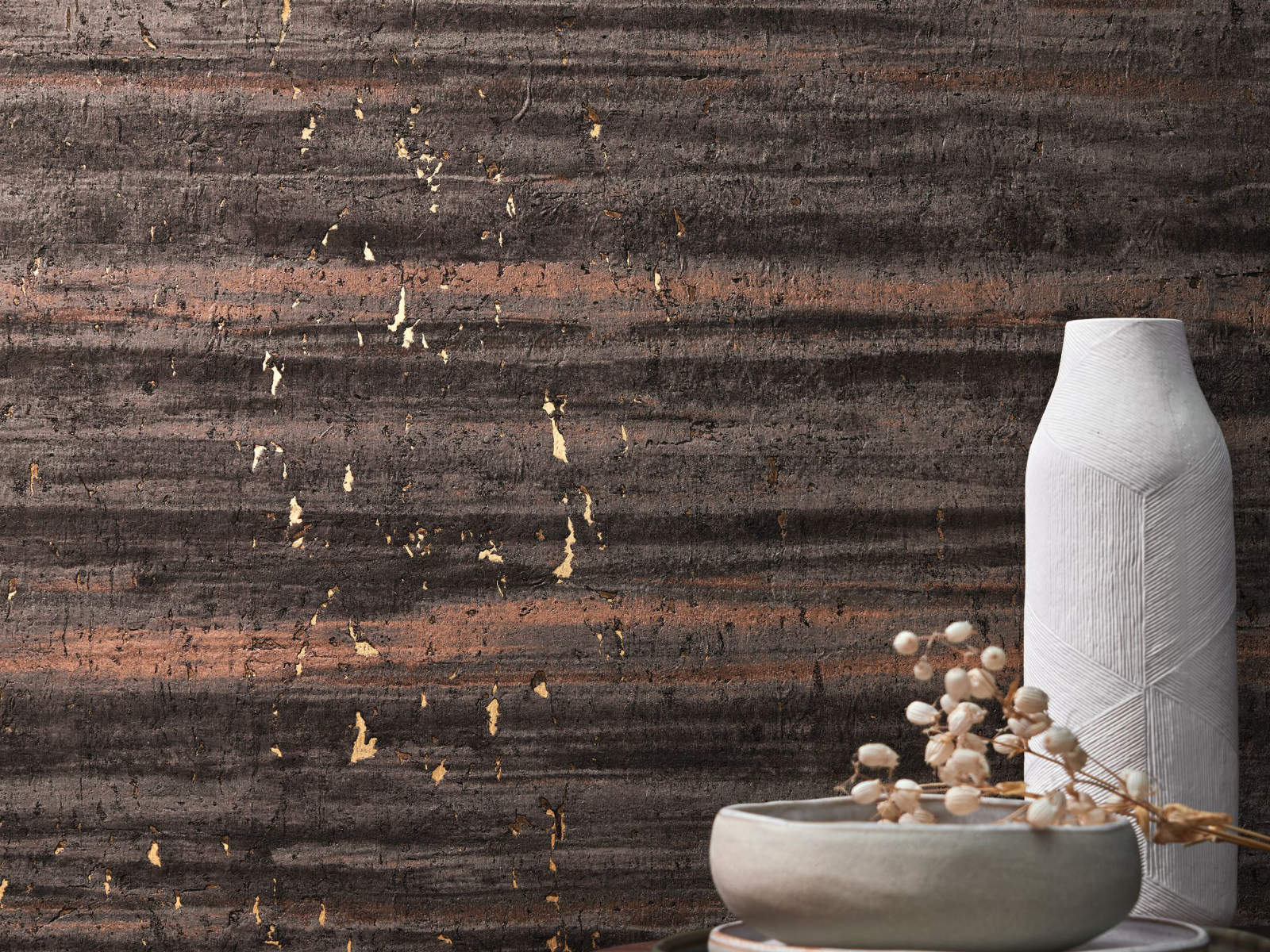 De Alternative Liège - 70790922 van Casamance behang is geïnspireerd door de natuurlijke schoonheid van kurk. Dit ecologische materiaal is natuurlijk, hernieuwbaar en recyclebaar. Het kurkbehang ondergaat verschillende behandelingen, waarbij een gouden folie tevoorschijn komt door de onregelmatige uitsparingen van de kurk, wat zorgt voor een metallic glans. Vervolgens wordt het gekleurd in een mix van matte en metallic tinten, zoals goud, zilver of brons, waardoor de onregelmatige textuur van de schors nog meer wordt benadrukt. Het resultaat is een uniek behang met een organisch dessin dat een luxe uitstraling geeft aan elke ruimte.
