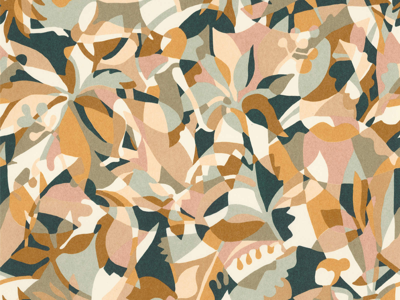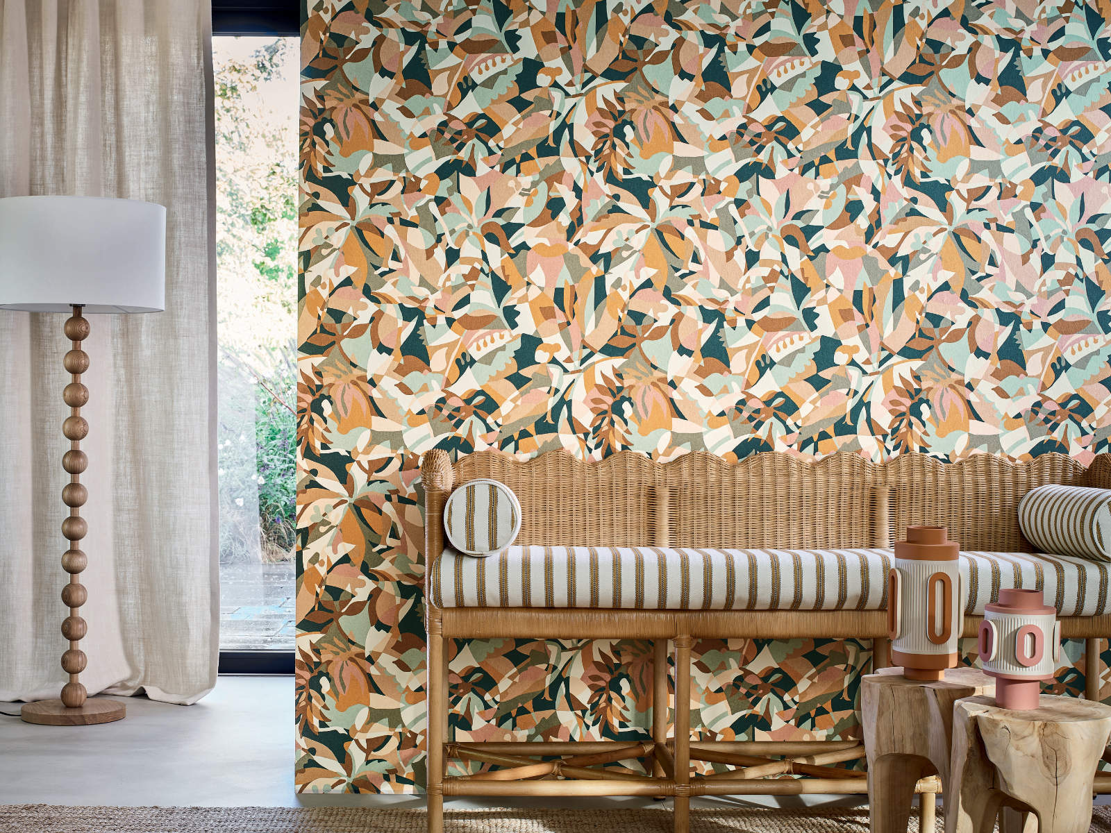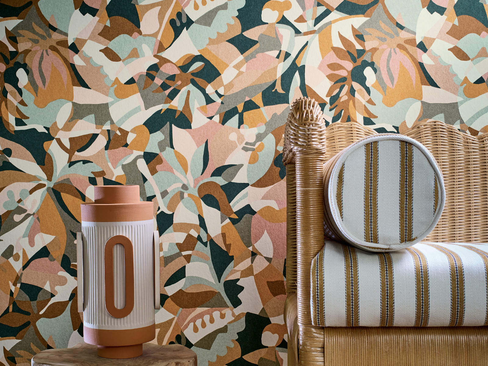De L'Île Aux Oiseaux Plongeon - 75880712 van Casamance behang is een prachtige verfrissende uitstraling in je interieur. In tegenstelling tot traditionele productietechnieken, is Plongeon gemaakt met behulp van een oude textiel drukmachine, met behulp van 10 films om een onaangepaste hoeveelheid kleur te verkrijgen. Silhouetten van zwemmers, gestileerde planten en abstracte vormen overlappen elkaar in een aquatische samensmelting.