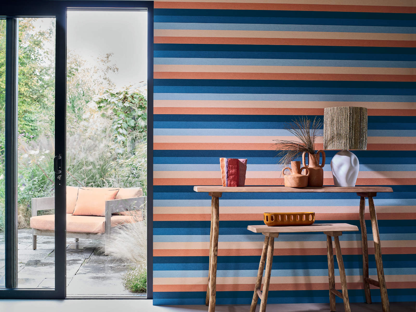 De L'Île Aux Oiseaux Transat - 75923466 van Casamance behang is een op papiervezel geïnspireerde textuur op een vlies ondergrond, met verticale strepen. De kleuren vormen samen een harmonieus geheel. Sommige elementen zijn helemaal mat en andere hebben een bronskleur dankzij de metallic inkt. Deze durf en onconventionele kleurencombinaties van dit behang zijn geïnspireerd op het Cap Ferret kleurenpalet.