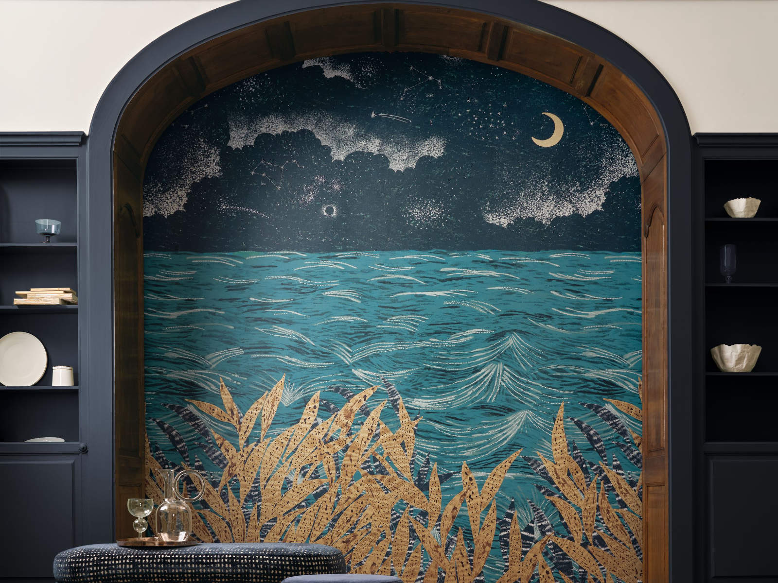 De Nuit D'Orient Callisto - 75432242 van Casamance behang is vernoemd naar de derde maan van het zonnestelsel. Dit behang neemt je mee naar een droomachtige wereld, een denkbeeldige en fantastische plek. Gemaakt met behulp van een digitale druk op een gouden achtergrond, is dit wandpaneel verkrijgbaar in twee versies: de ene om de dag weer te geven en de andere de nacht. Samengesteld uit verschillende oneindig combineerbare panelen, betovert dit dessin de zintuigen en brengt ons ver tussen droom en realiteit.