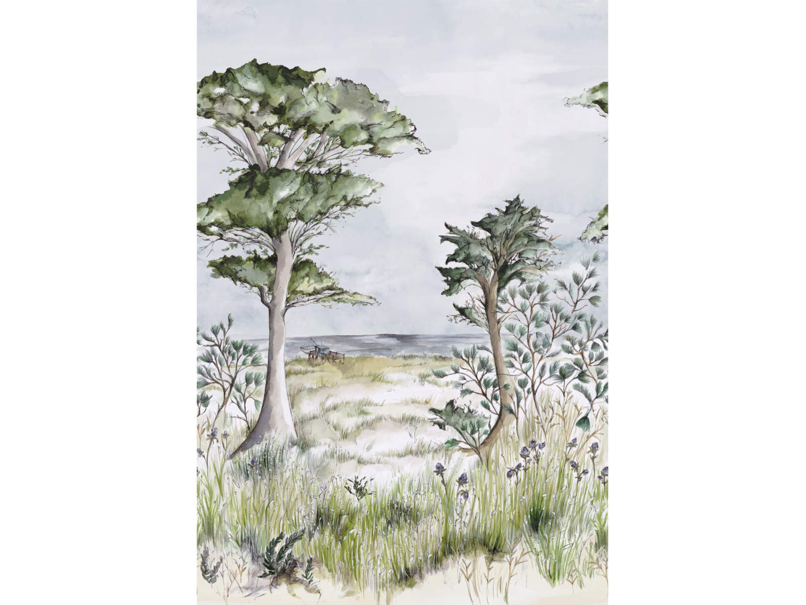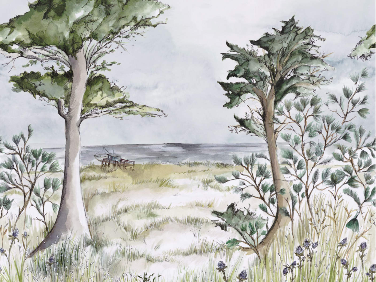 De Panoramas 2 Pornic Int - 75840100 van Casamance behang is een reis naar de oceaan, de Atlantische kust. Ervaar de zeebries, wilde grassen, zand en parasoldennen. In de verte een vissershut op palen, verbonden met het land door een ponton. Dit wandpaneel, gemaakt met gekleurde inkten, vat Pornic samen en geeft de sfeer weer.