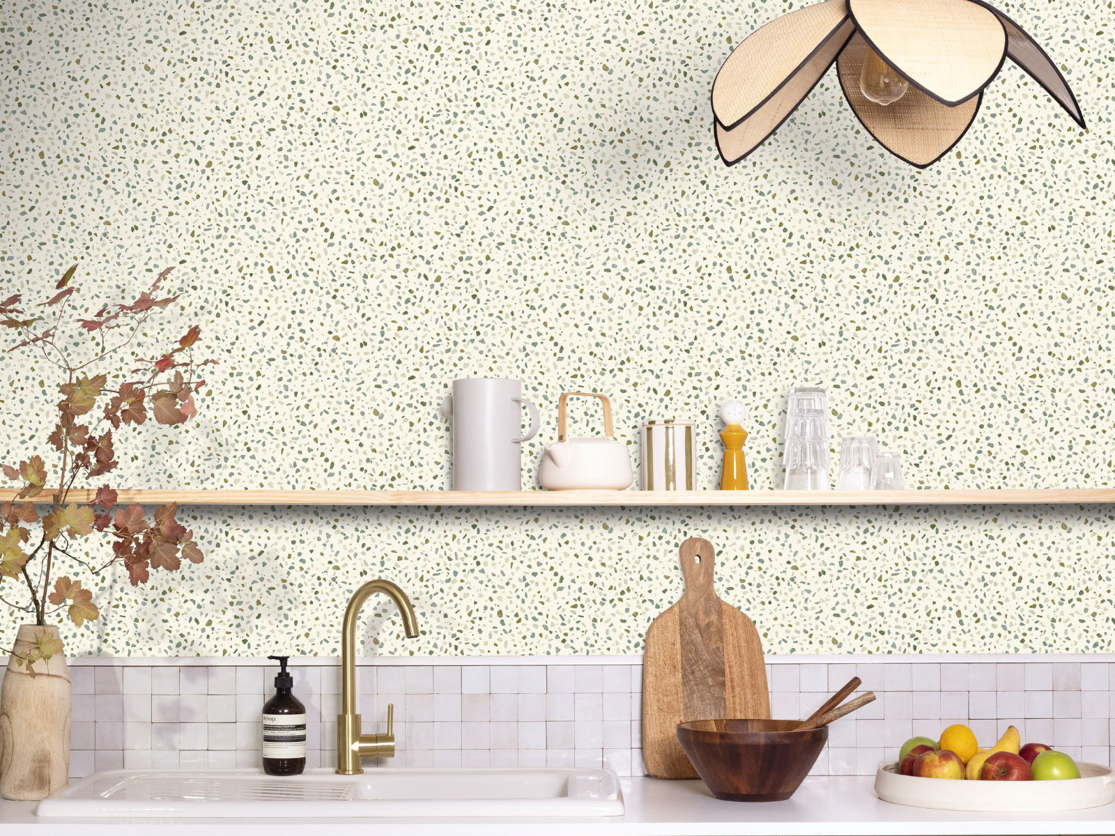 Alsof je een designblad openslaat: het behang uit de Caselio Kitchen Box Granito collectie brengt de populaire terrazzo-look naar je keuken. Met zijn speelse patroon van fijne steensplinters creëer je een chic mineraal effect dat licht, structuur en moderniteit toevoegt aan je interieur.