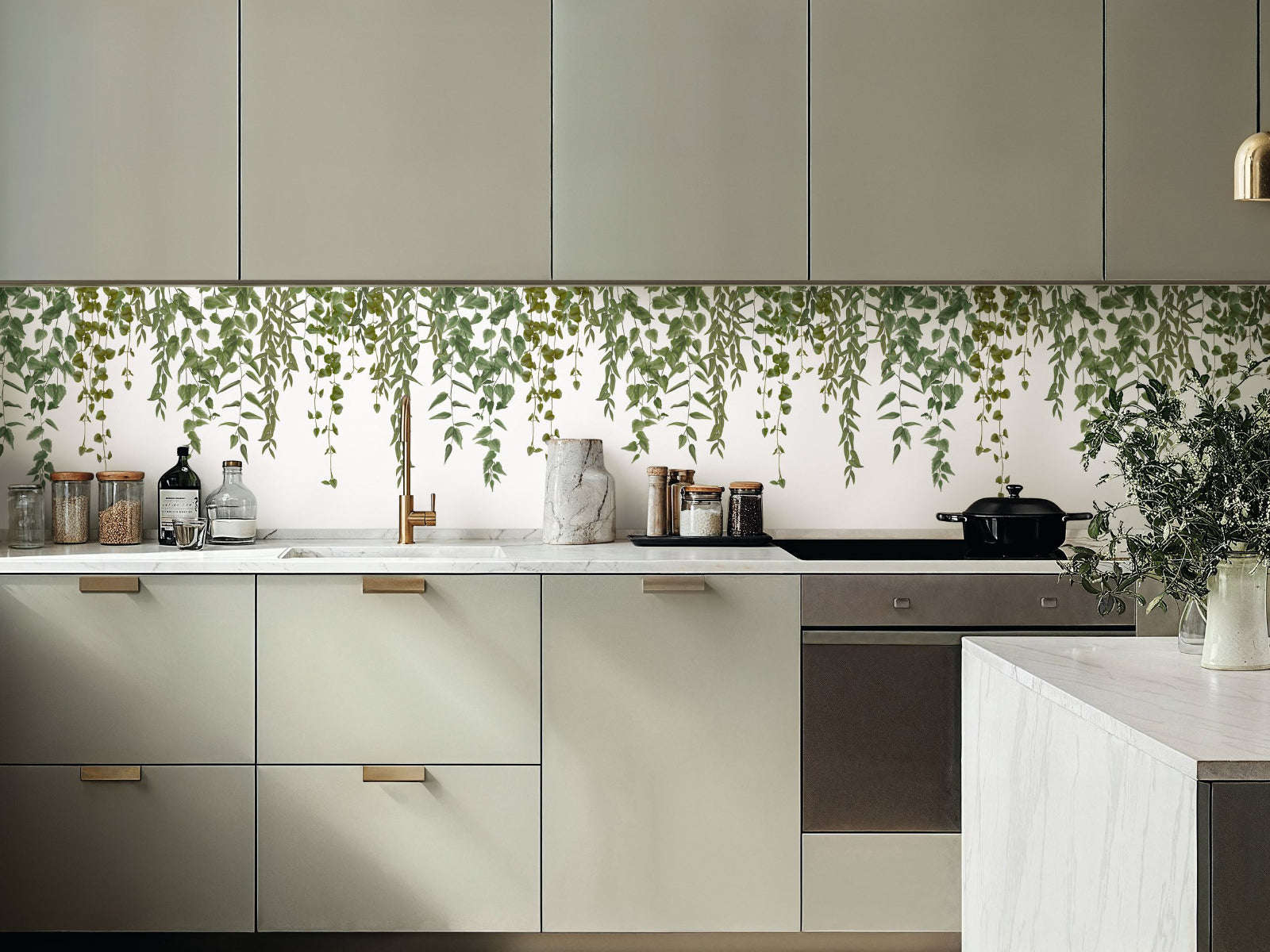 Een decoratieve border van 6 meter breed en 53 cm hoog die je keuken omtovert tot een groene oase: dat is het effect van het behang uit de Caselio Kitchen Box Green Waterfalls collectie. Met zijn levendige botanische print en trompe-l'œil-uitstraling creëer je eenvoudig het gevoel van een waterval van bladeren die langs je muur stroomt.