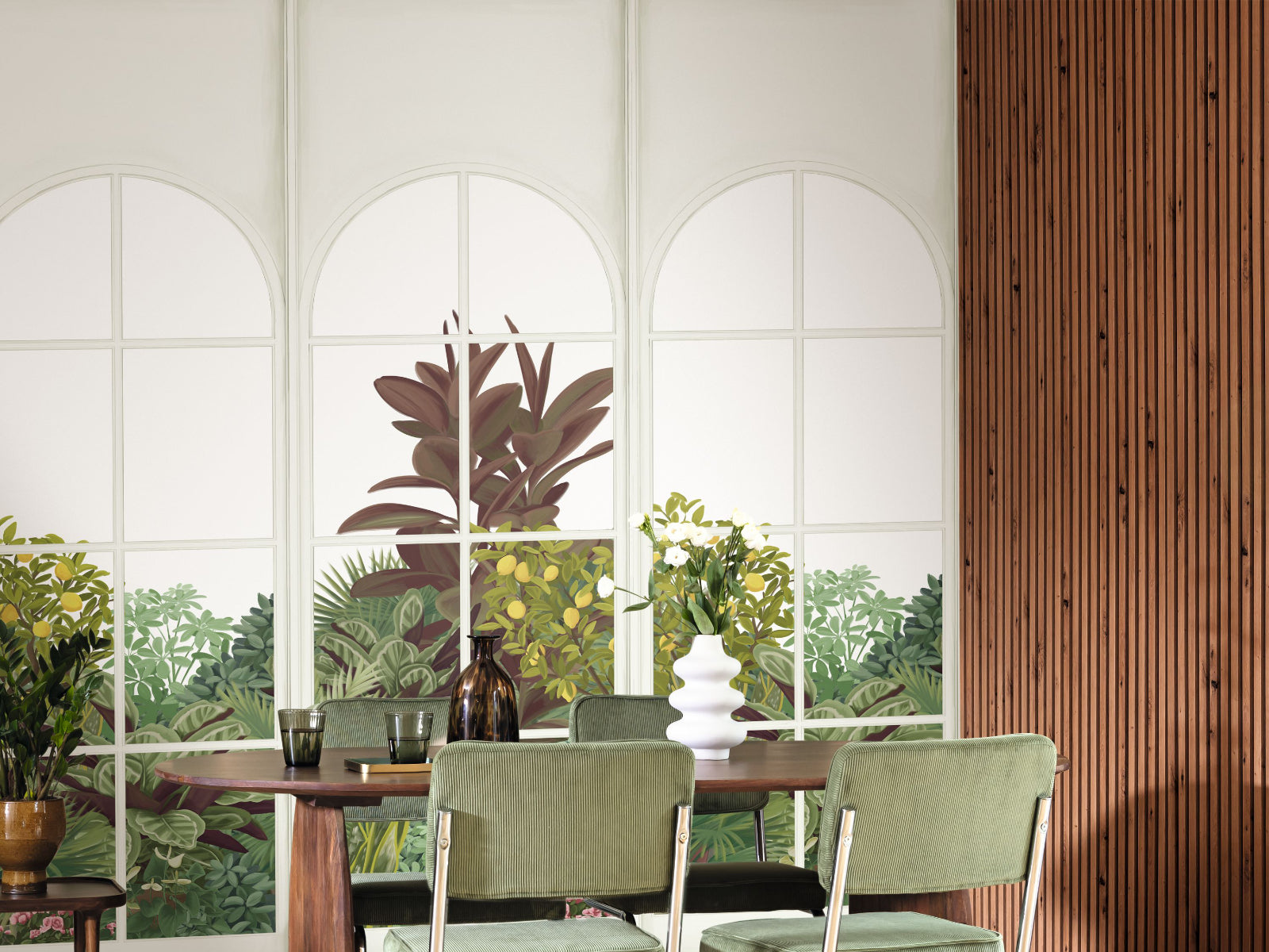 Alsof je uitkijkt op een groene serre: het behang uit de Caselio Kitchen Box Verdant Cascade collectie wekt de illusie van een klassieke tuin achter glas. Deze panoramische print met trompe-l’œil-effect brengt een rustgevend botanisch uitzicht naar je keuken en laat je elke dag genieten van natuurlijk licht en groen, zonder verbouwing.