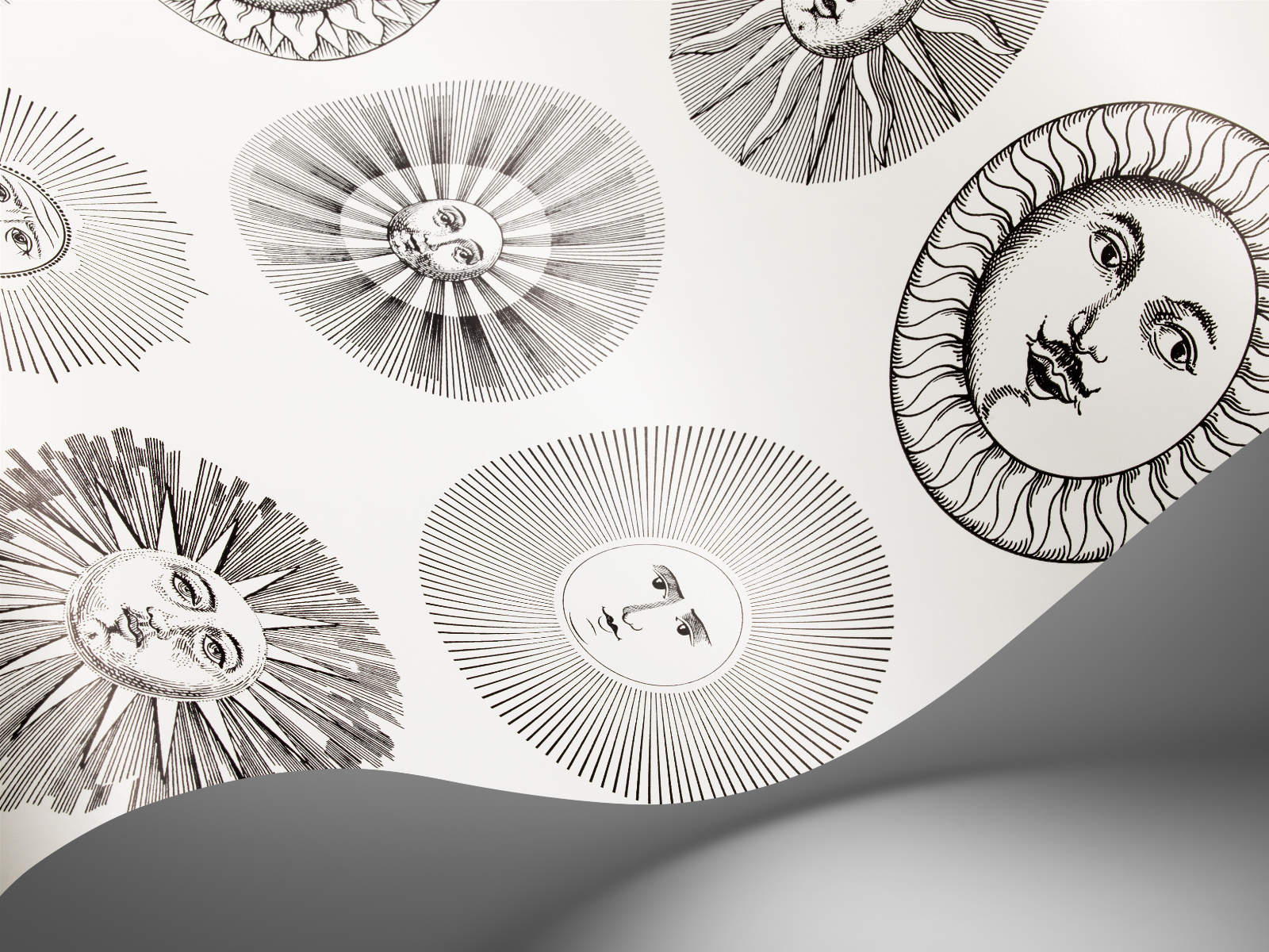 De Fornasetti Senza Tempo II Soli - 123/1001 van Cole & Son is een pronkstuk uit het portfolio van het Atelier. De zon, een centraal symbool binnen het Fornasetti repertoire van natuurlijke vormen, straalt een unieke positie uit in het visuele universum. De voorliefde voor de zon is deels te danken aan de bijzondere opdrachten van Gio Ponti aan Piero Fornasetti in de vroege jaren '40. Fornasetti ontwierp toen almanakken met een maanthema als kerstgeschenken, wat de zon een blijvende inspiratiebron maakte.