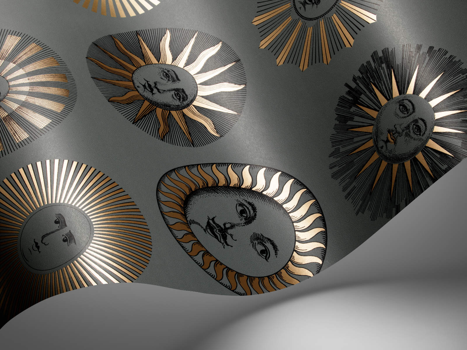 De Fornasetti Senza Tempo II Soli - 123/1003 van Cole & Son is een pronkstuk uit het portfolio van het Atelier. De zon, een centraal symbool binnen het Fornasetti repertoire van natuurlijke vormen, straalt een unieke positie uit in het visuele universum. De voorliefde voor de zon is deels te danken aan de bijzondere opdrachten van Gio Ponti aan Piero Fornasetti in de vroege jaren '40. Fornasetti ontwierp toen almanakken met een maanthema als kerstgeschenken, wat de zon een blijvende inspiratiebron maakte.