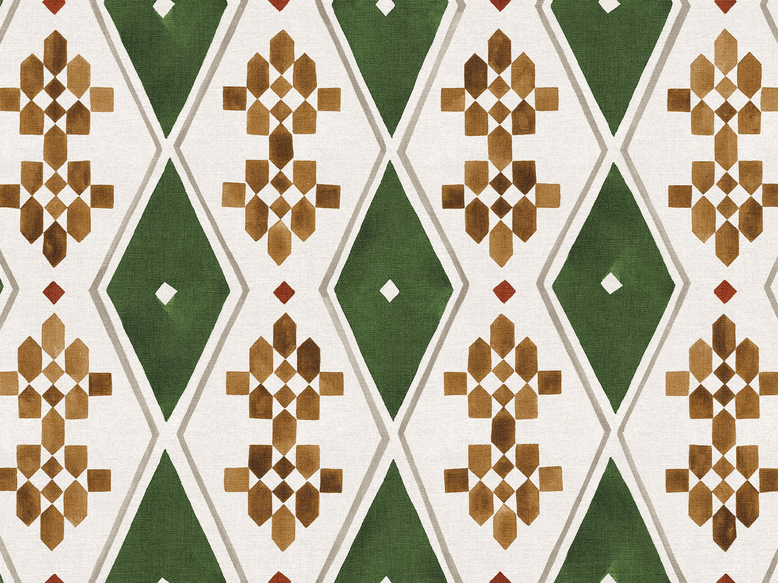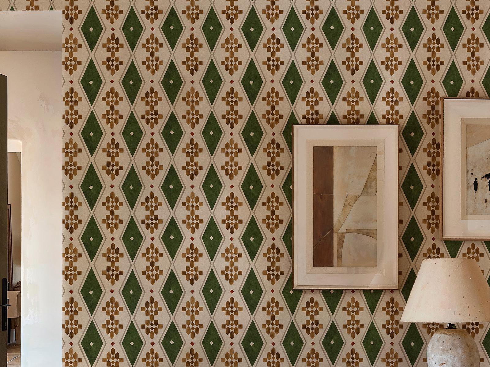 Een eerbetoon aan tijdloze stijl en vakmanschap: het Coordonné Beldi Rugs behang brengt de sfeer van klassieke tapijten naar je muren. In diepe groentinten en met een rijke textuurlook combineert dit ontwerp een verfijnd geometrisch patroon van ruiten en lijnen. Geïnspireerd op de iconische vloerkleden die de ruimtes en modeshows van Yves Saint Laurent sierden, creëert dit behang een warme, stijlvolle sfeer met culturele diepgang.