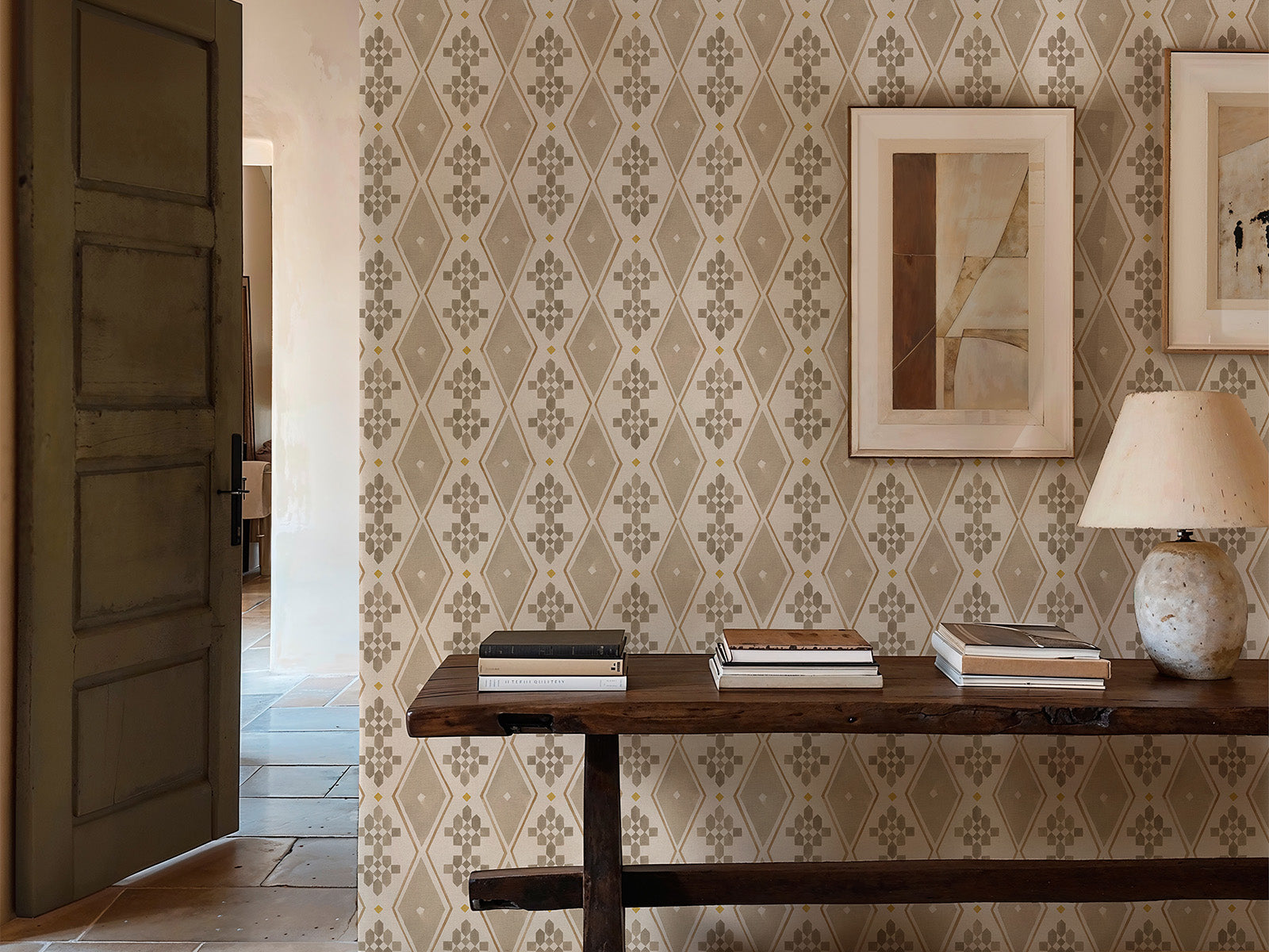 Een eerbetoon aan tijdloze stijl en vakmanschap: het Coordonné Beldi Rugs behang brengt de sfeer van klassieke tapijten naar je muren. In diepe groentinten en met een rijke textuurlook combineert dit ontwerp een verfijnd geometrisch patroon van ruiten en lijnen. Geïnspireerd op de iconische vloerkleden die de ruimtes en modeshows van Yves Saint Laurent sierden, creëert dit behang een warme, stijlvolle sfeer met culturele diepgang.