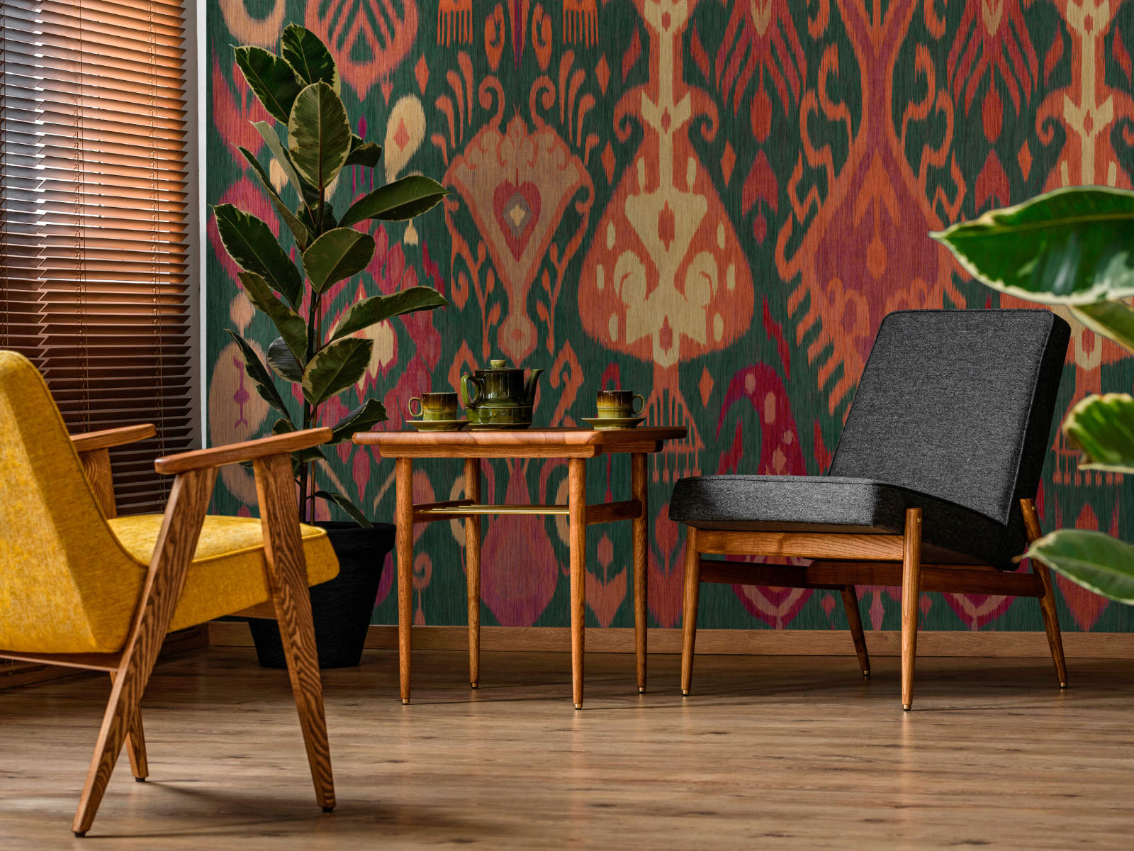 Breng de vrije geest van wereldse ambacht in huis met het Ikart Boho behang van Coordonné. Dit expressieve ontwerp is een botanische en ornamentale mix vol bohemian flair, geïnspireerd op handgemaakte culturele decoraties. De rijke ikat-structuren en organische vormen zorgen voor een levendig patroon dat warmte en karakter uitstraalt.