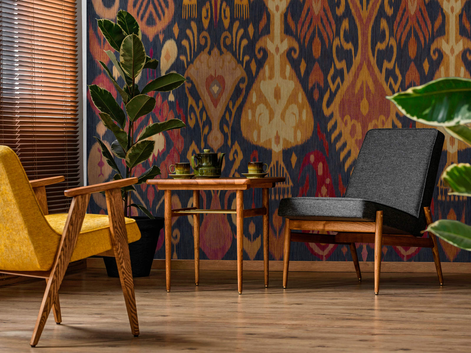 Breng de vrije geest van wereldse ambacht in huis met het Ikart Boho behang van Coordonné. Dit expressieve ontwerp is een botanische en ornamentale mix vol bohemian flair, geïnspireerd op handgemaakte culturele decoraties. De rijke ikat-structuren en organische vormen zorgen voor een levendig patroon dat warmte en karakter uitstraalt.