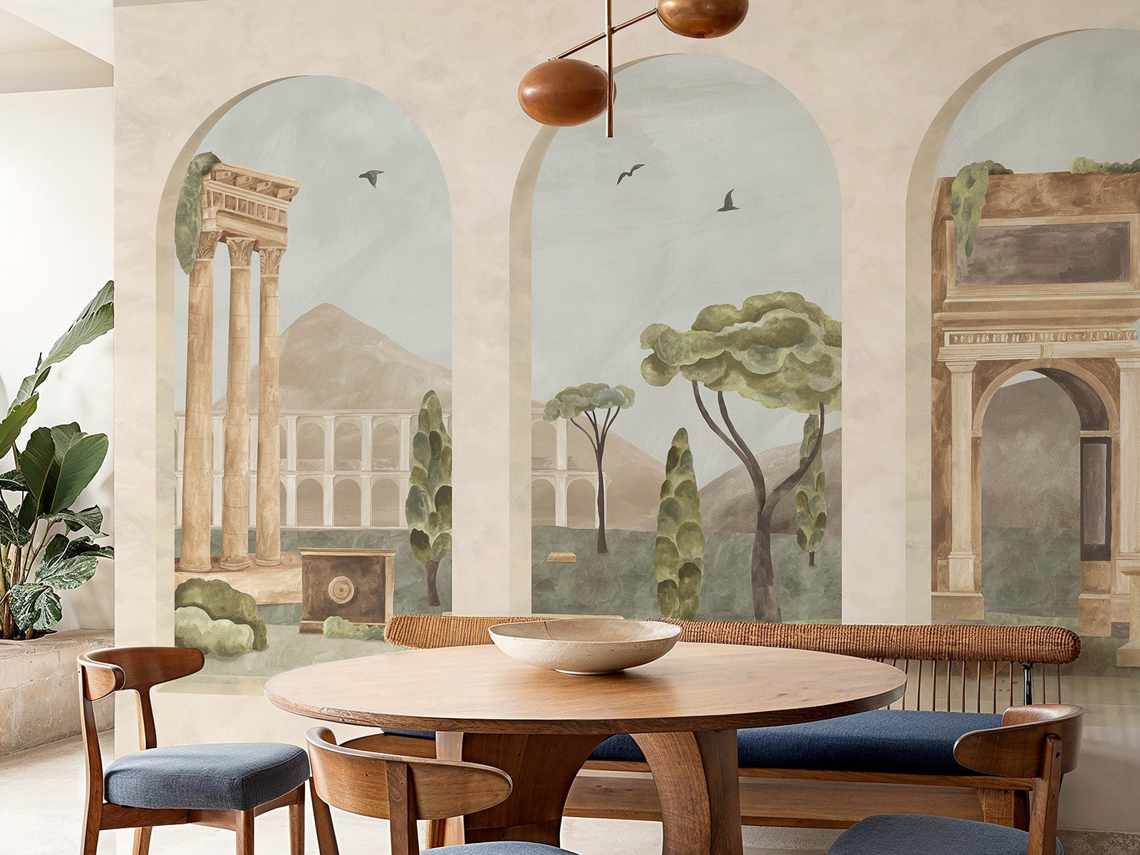 Laat je meevoeren naar het kloppend hart van het oude Pompeï met het Forum behang uit de Pompei collectie van Coordonné. Dit landschapspatroon biedt een sfeervol uitzicht tussen verweerde bogen en ruïnes, waar ooit het bruisende openbare leven plaatsvond. Het decor combineert botanische elementen met klassieke architectuur en roept een tijdloos gevoel van geschiedenis en beweging op.