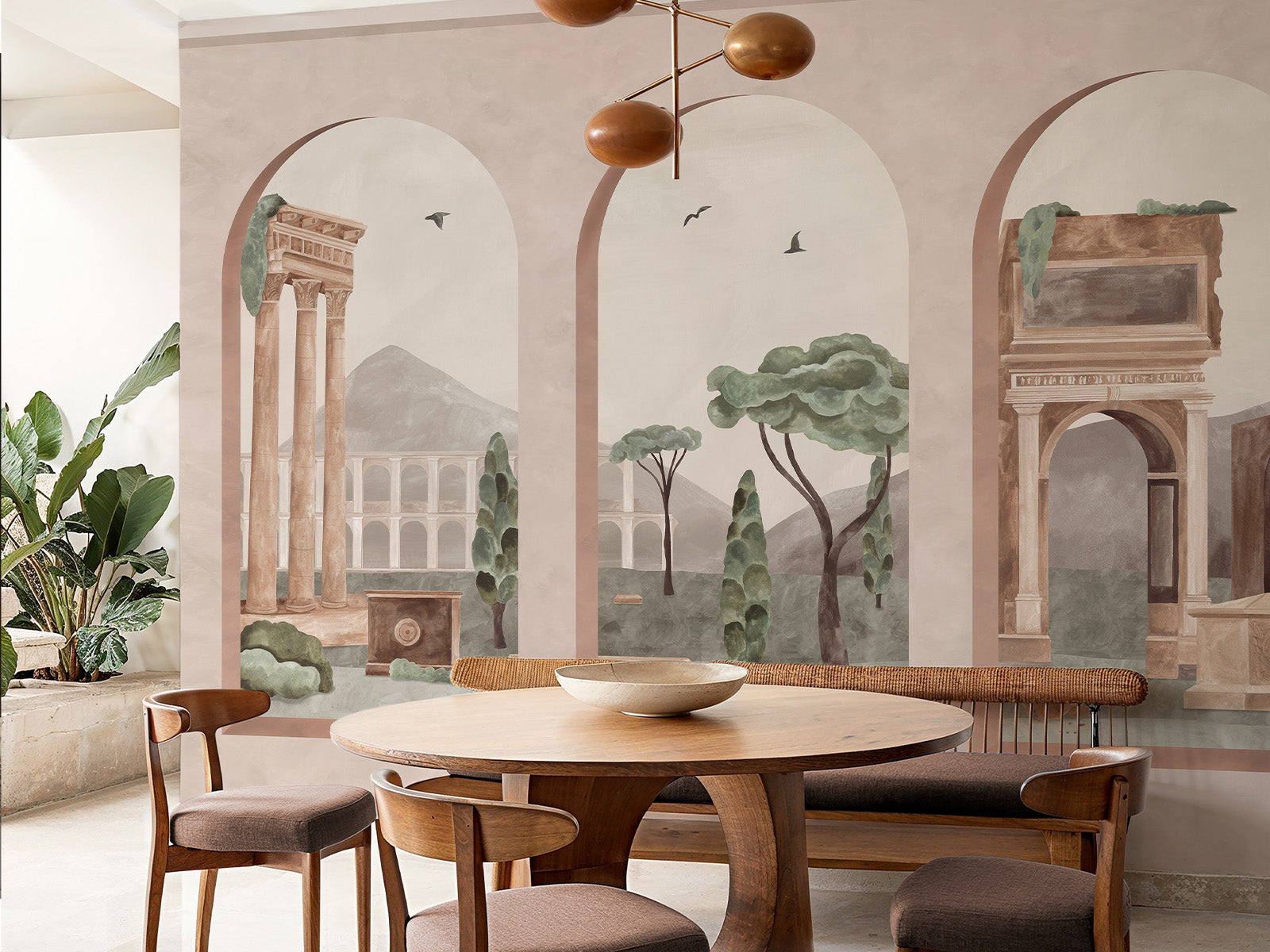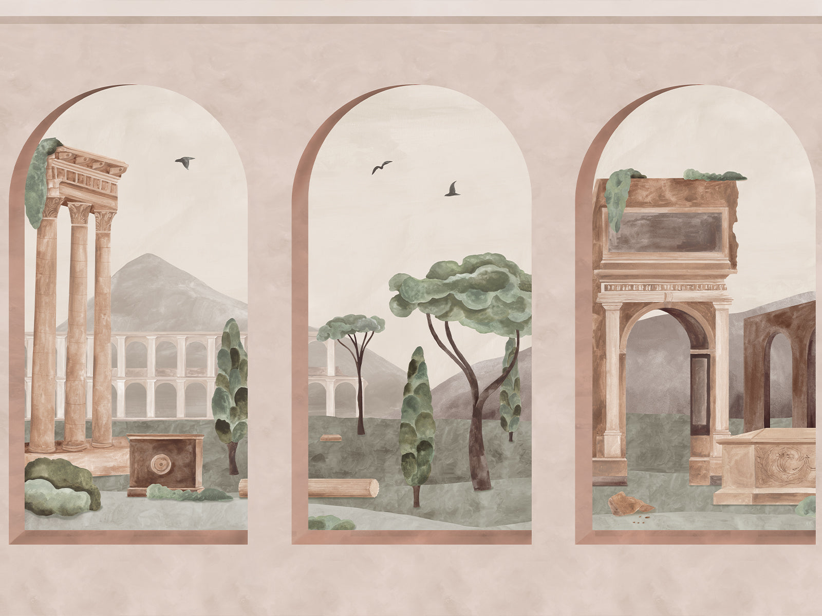 Laat je meevoeren naar het kloppend hart van het oude Pompeï met het Forum behang uit de Pompei collectie van Coordonné. Dit landschapspatroon biedt een sfeervol uitzicht tussen verweerde bogen en ruïnes, waar ooit het bruisende openbare leven plaatsvond. Het decor combineert botanische elementen met klassieke architectuur en roept een tijdloos gevoel van geschiedenis en beweging op.