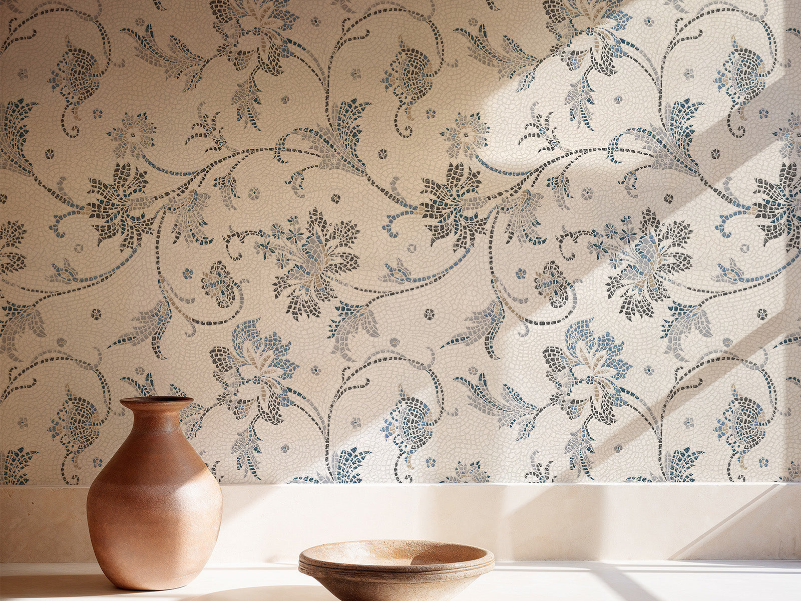 Geïnspireerd op de rijkversierde vloeren van Romeinse paleizen brengt het Mosaicum behang uit de Pompei collectie van Coordonné een ode aan de kunst van marmer en glasmozaïek. Dit botanische bloemen patroon straalt finesse en ambacht uit, alsof elke tesseras met de hand gelegd is. Het resultaat? Een luxueuze, levendige wandbekleding met een klassieke ziel en een moderne uitstraling.