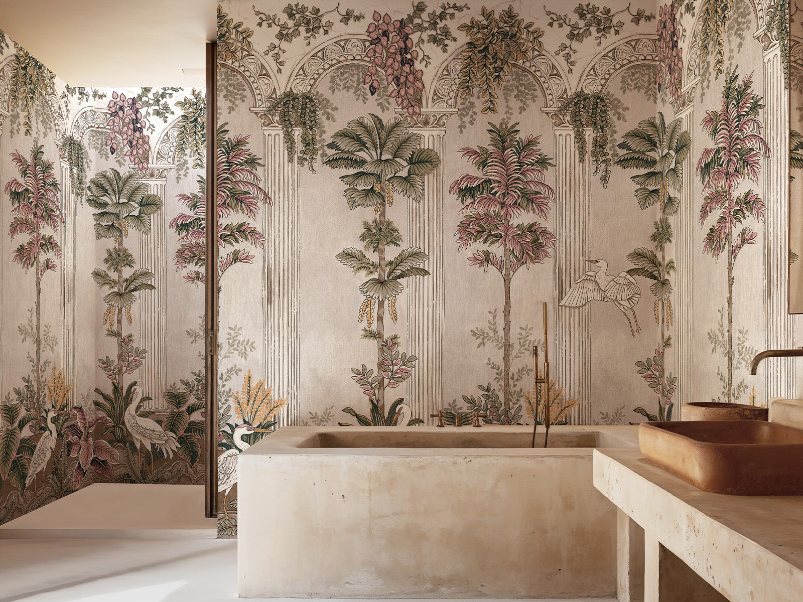 Het behang is beschikbaar in vlies of vinyl en heeft een rechte aanzet voor een naadloze afwerking. Thermae is leverbaar in vier stijlvolle kleurvarianten en vormt een opvallend statement in elke ruimte waar geschiedenis, kunst en natuur samenkomen. Ideaal voor wie van karaktervolle muren met een verhaal houdt.