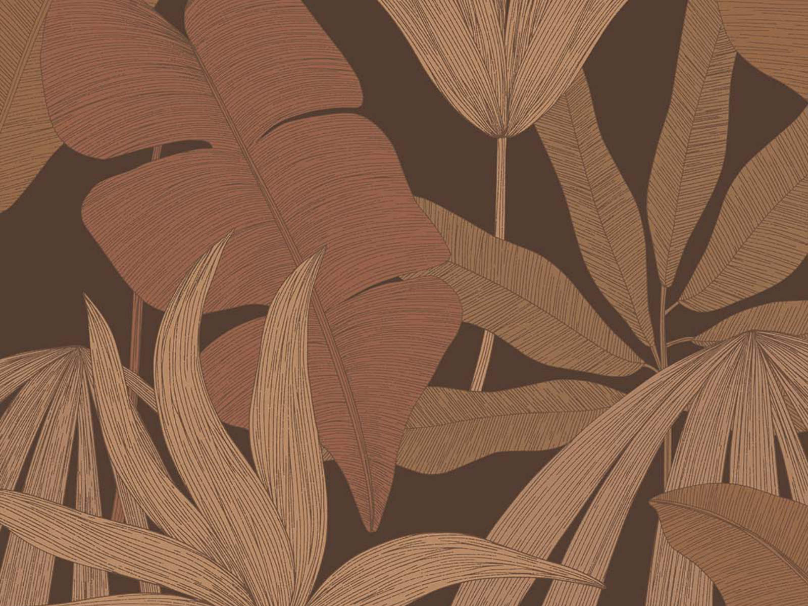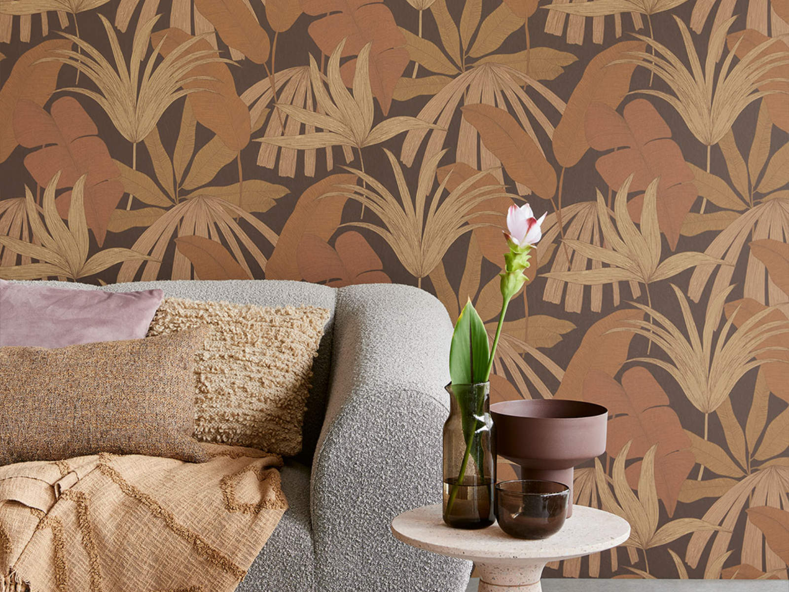 De Festival - 333501 van Eijffinger brengt met de tropische bladeren een speelse, exotische sfeer in huis, en de kleuren geven je het gevoel alsof je midden in een prachtige Indian Summer bent.
