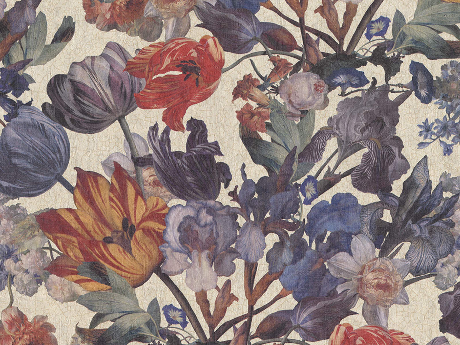De Masterpiece - 358011 van Eijffinger behang is een dessin van weelderige bloemen die afsteken tegen de donkere- of klassiek crème achtergronden gedrukt op een vliesbehang.